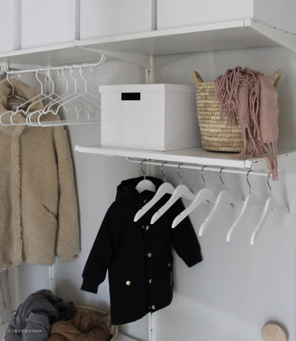 对于通勤挂衣区的打造,屋主根据大家的身高来分配区域。大人在上孩子在下。这样,家里的两个孩子也能自己挂衣物,同时也充分使用了墙面空间。