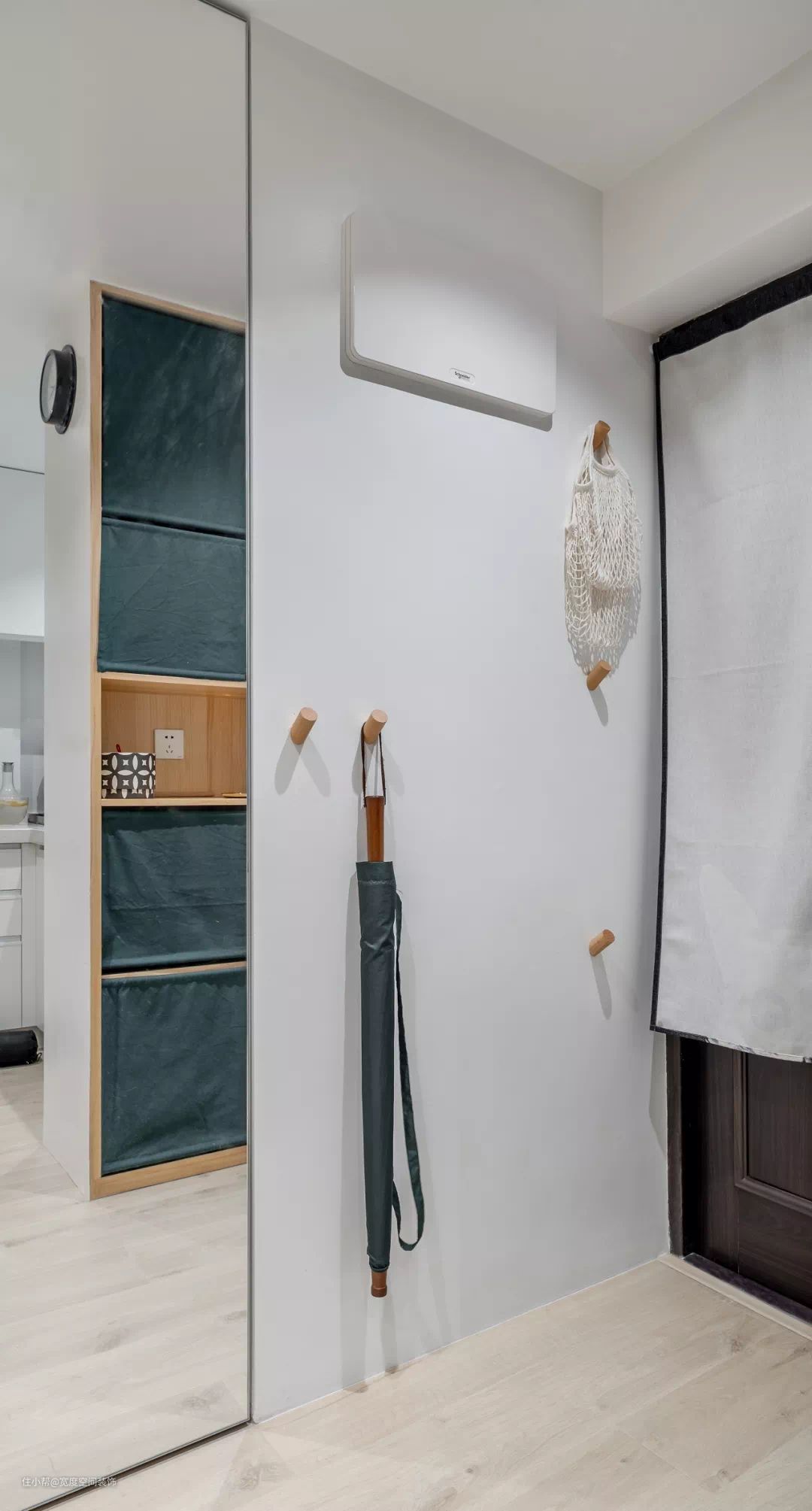 简单一些呢,就直接上挂钩。设计师燕冷霖&郭东海,将屋主玄关处的一侧墙上安装了几个挂钩,让回家后的外套、包包和雨伞都有了去处。也是分散分布,高低都有。
