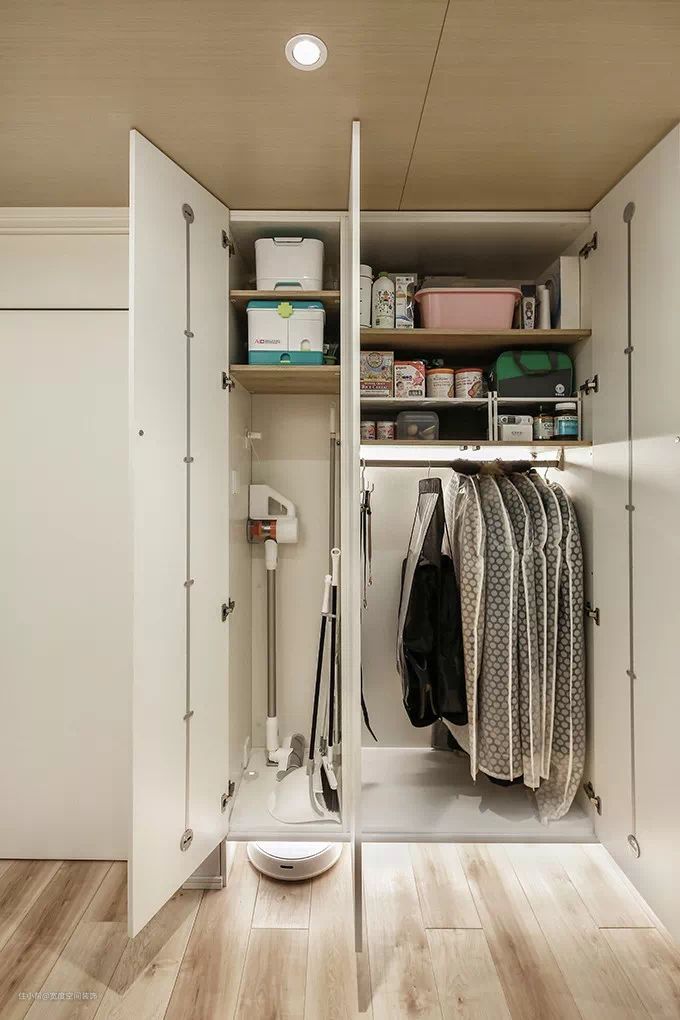 这是设计师王恒老师设计的融合了多种功能的玄关空间。右面的柜子区域,包含了鞋柜、通勤衣物柜、清洁工具柜和开放式柜。