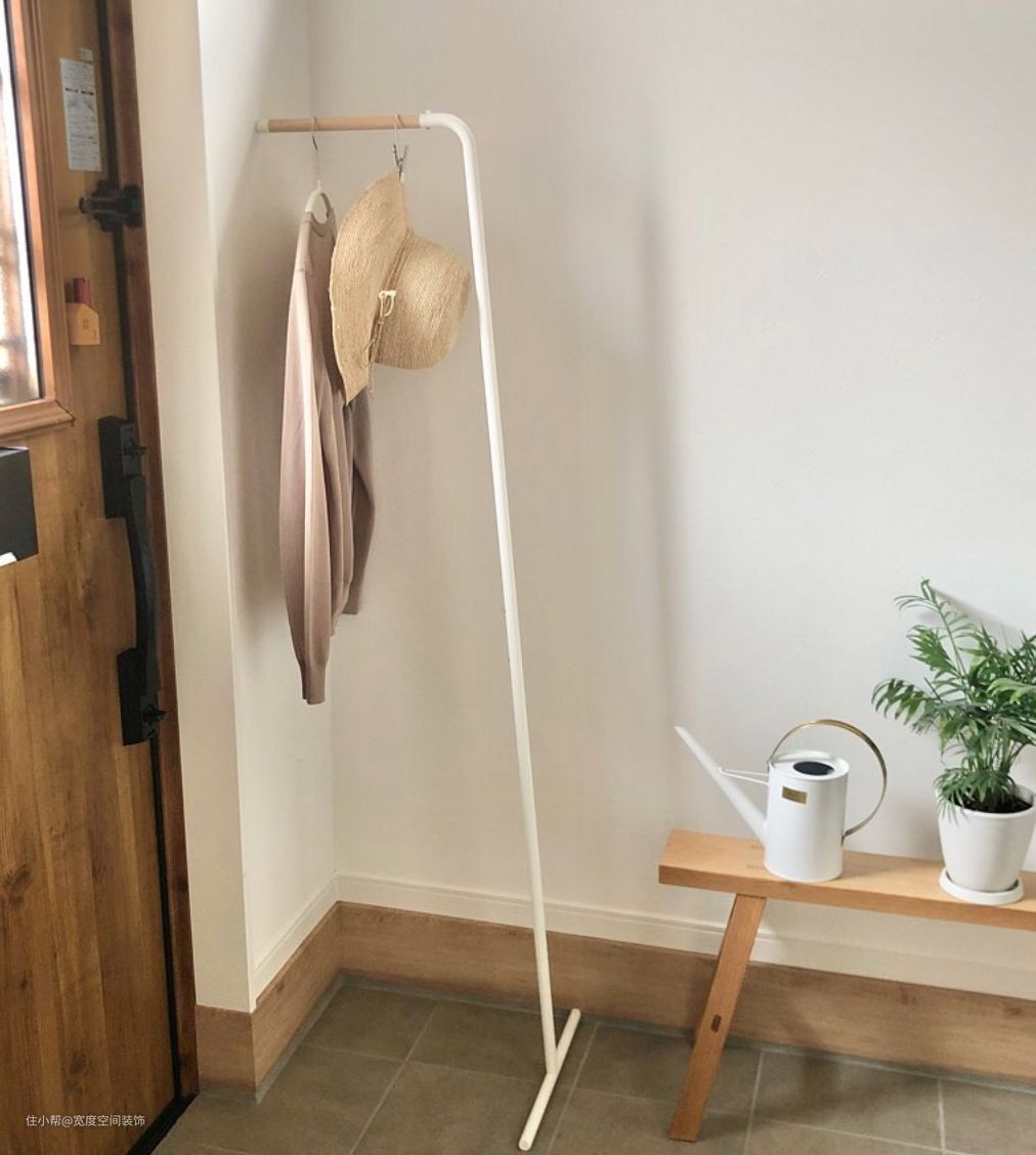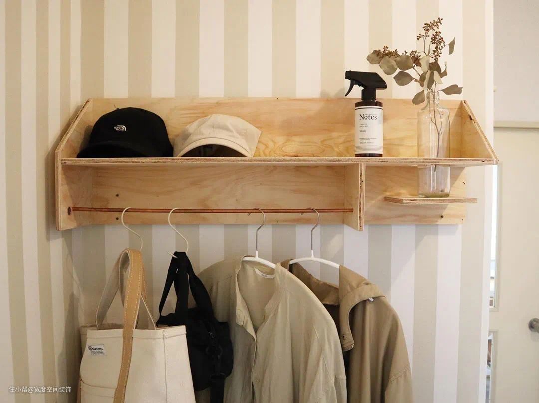 INS博主ehami123自己用木板打造了一个玄关柜,能悬挂通勤衣物和放置帽子。简单实用。其实只要通勤衣物有固定位置放,就解放了其他空间,家就慢慢整洁起来啦。