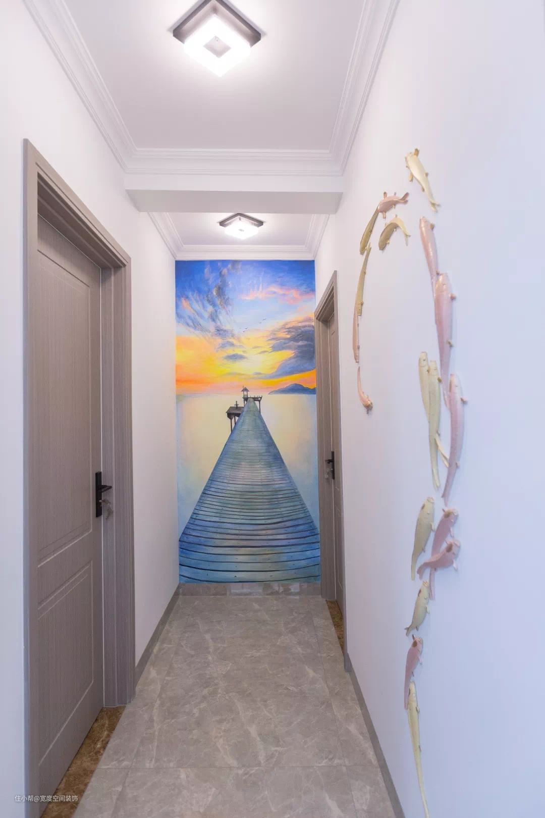 在走廊尽头的这面墙绘上延续走廊空间视觉的画面,让走廊产生一种无限延绵的空间错觉,让小走廊也显得无限宽阔大方。