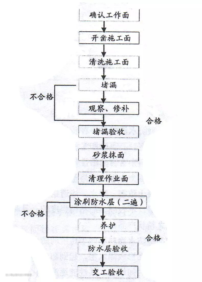 ▲防水流程:基层表面清理和找平→涂刷防水层→闭水试验→防水保护层→防水验收。