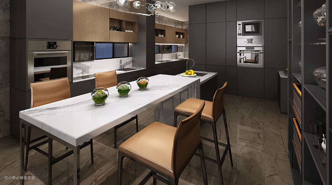 厨房台面选用岩板材质,可以避免油烟污渍难清洁的问题,耐高热和腐蚀,使用效果很nice。