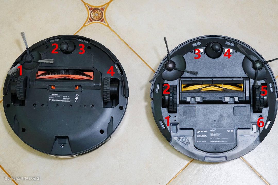机器人翻过来看底部,米家仅拥有 4颗放跌落传感器;而科沃斯则拥有顶配级别的 6颗 ▲