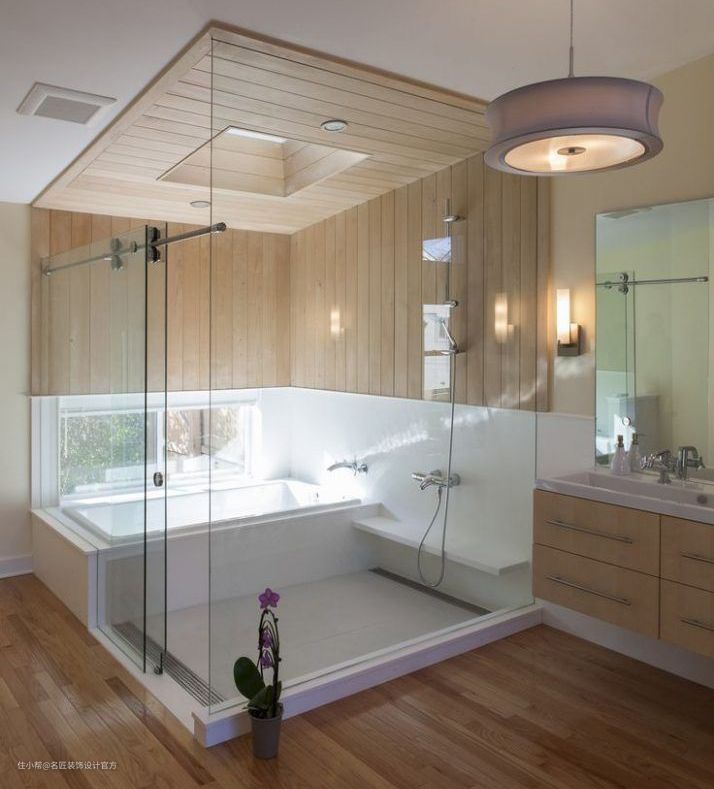 1.吊平:把整个卫生间的顶部做平的吊顶,这样的设计整体性比较强,是一种设计视觉效果比较强的方案。