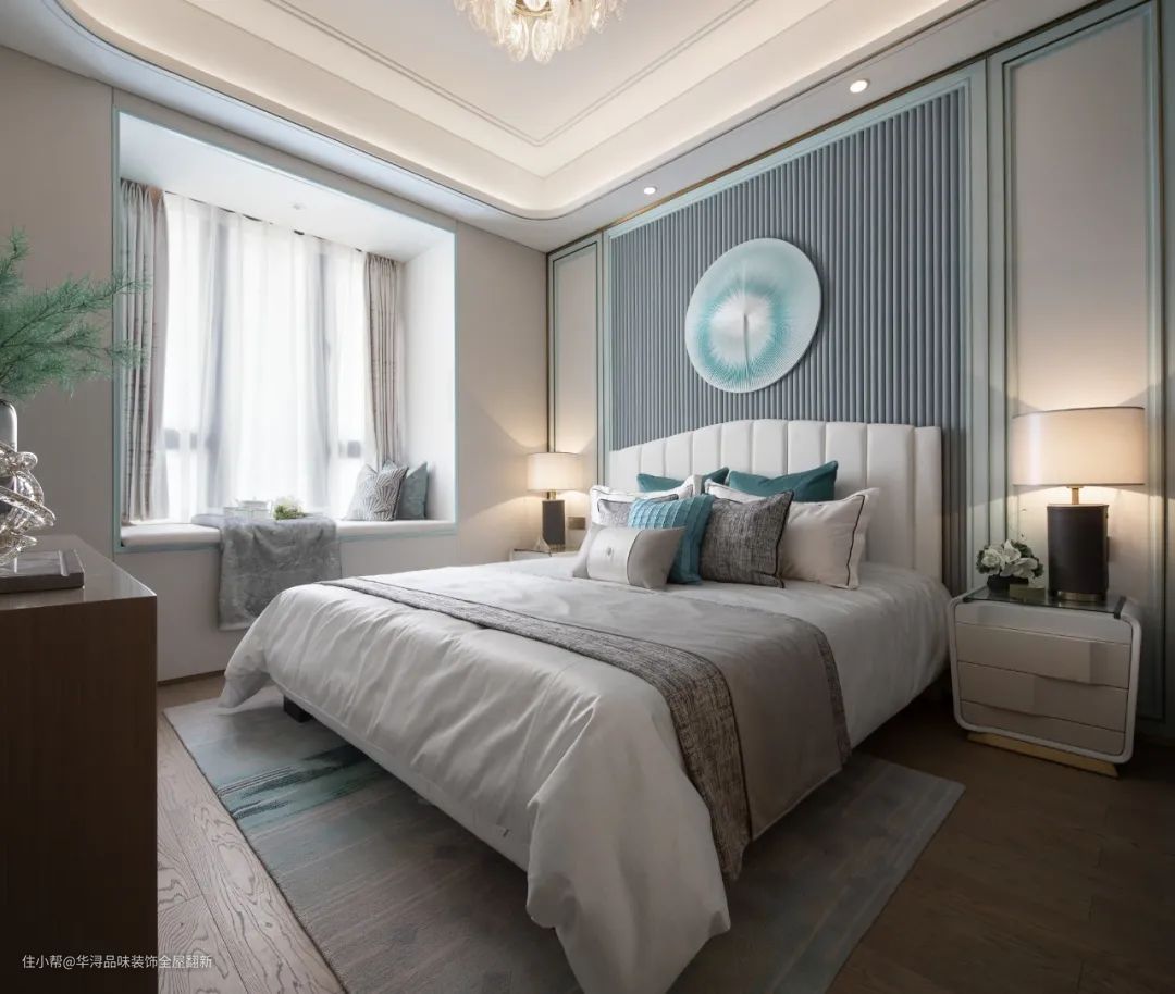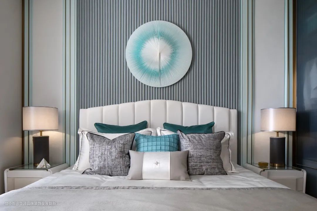 ▲床头墙的蓝色放射图案挂画,还有两侧床头柜的台灯布置,也让空间显得更加舒适而精致高级。
