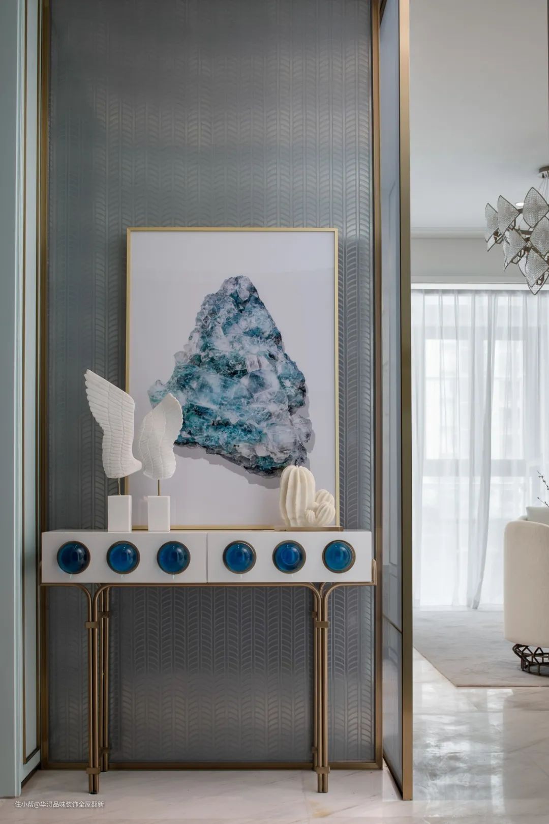 ▲玄关设置了一个端景台,金属架与蓝色抽屉门板上的蓝色装饰,端景台上的雕塑,抽象的宝石装饰画,都让进门空间显得更加华丽优雅而高级艺术。