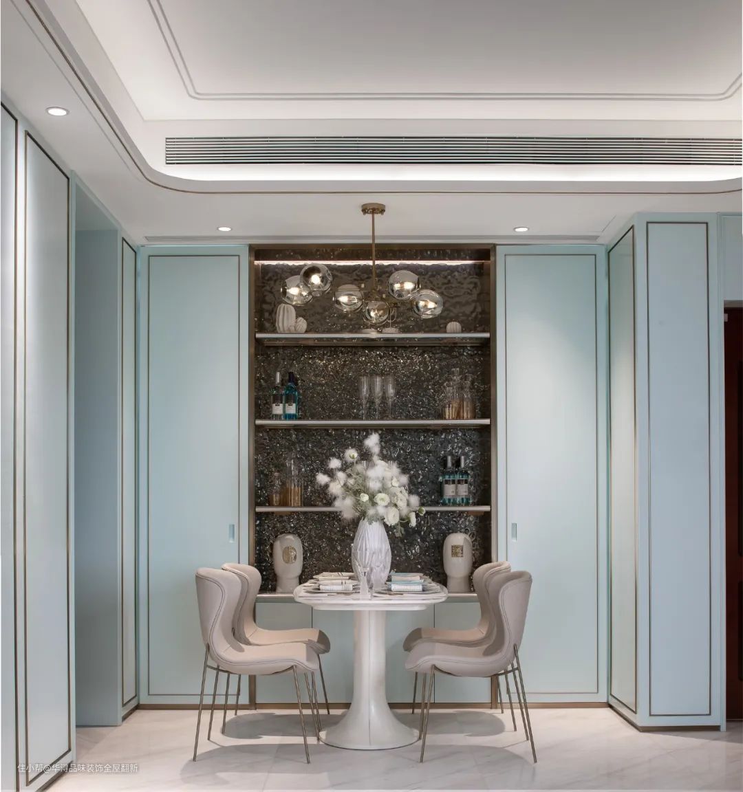 ▲餐厅背景墙延续了客厅的淡蓝色,布置上优雅造型的餐桌与皮餐椅,靠放餐桌墙面装上多层开放的展示架,布置花瓶与展示品,也让空间显得更加高级精致而档次。