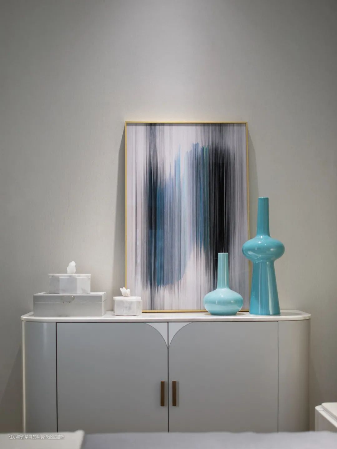 ▲床尾位置布置斗柜,上边摆着蓝色陶艺品,还有一幅色彩竖线条装饰画,让空间也更加有艺术的优雅气质。