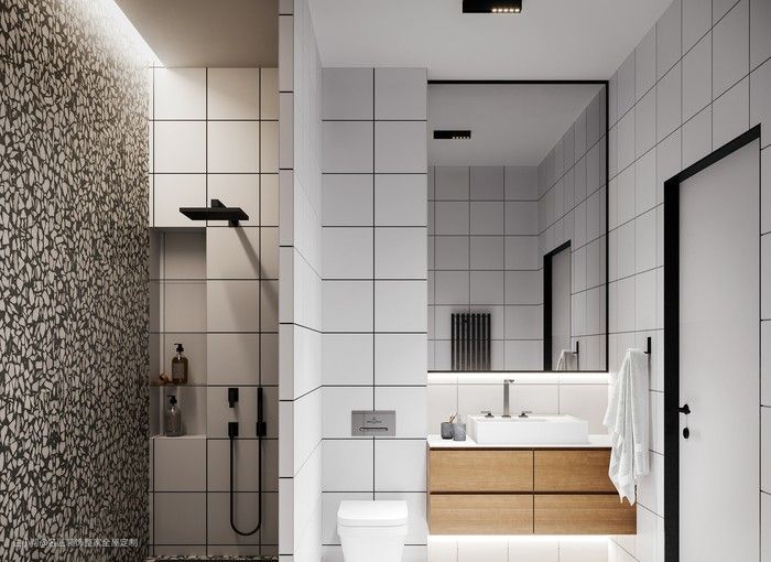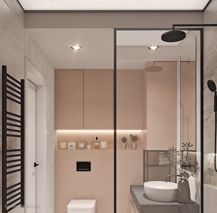 1.吊平:把整个卫生间的顶部做平的吊顶,这样的设计整体性比较强,是一种设计视觉效果比较强的方案。