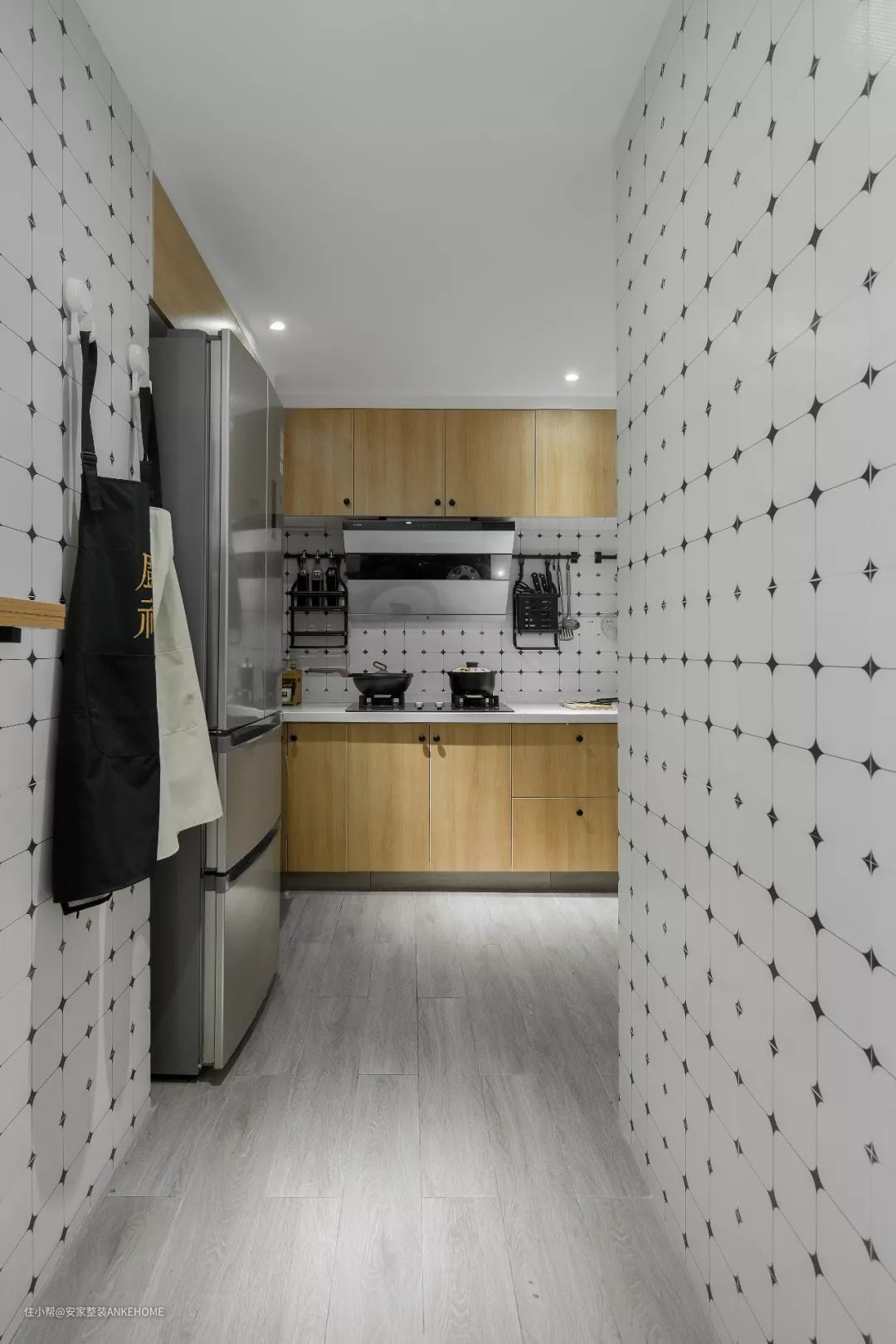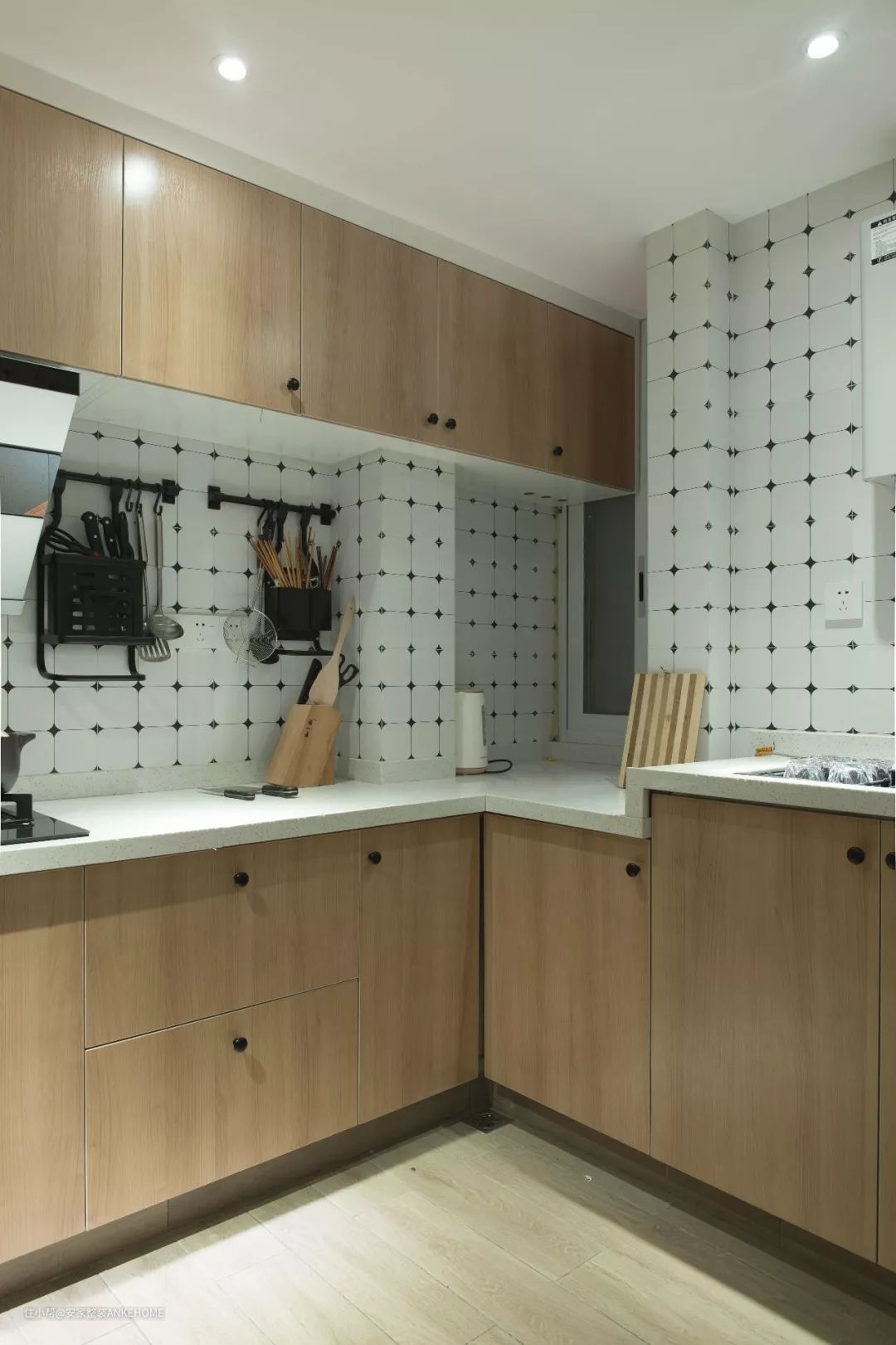 厨房的墙面铺贴了白色的瓷砖,然后设计师给它加上黑色的角花,让厨房看起来层次感更强,自然也显得更为宽敞和明亮。