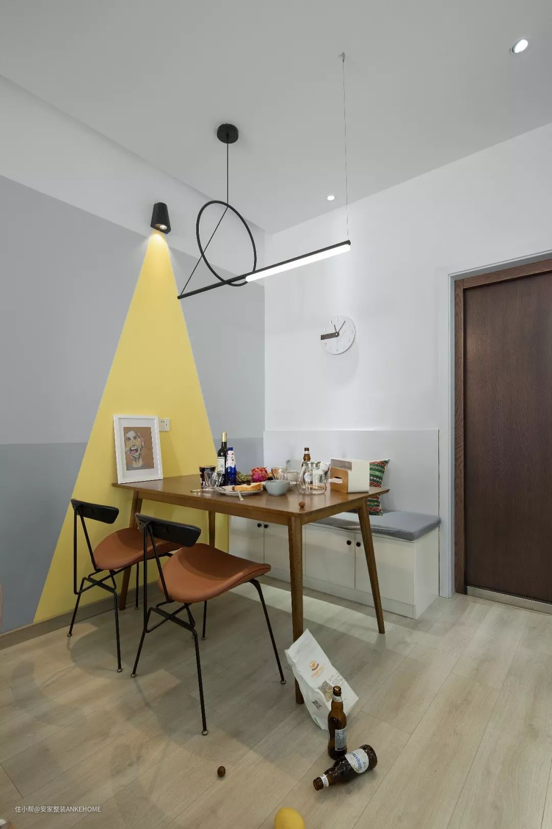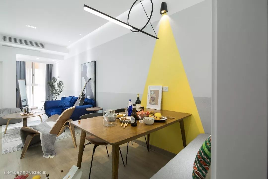 餐厅这个区域设计成了卡座式的,让它拥有更多的储物空间。亮黄色的三角形刷在墙面上,让餐厅看起来更有活力感。