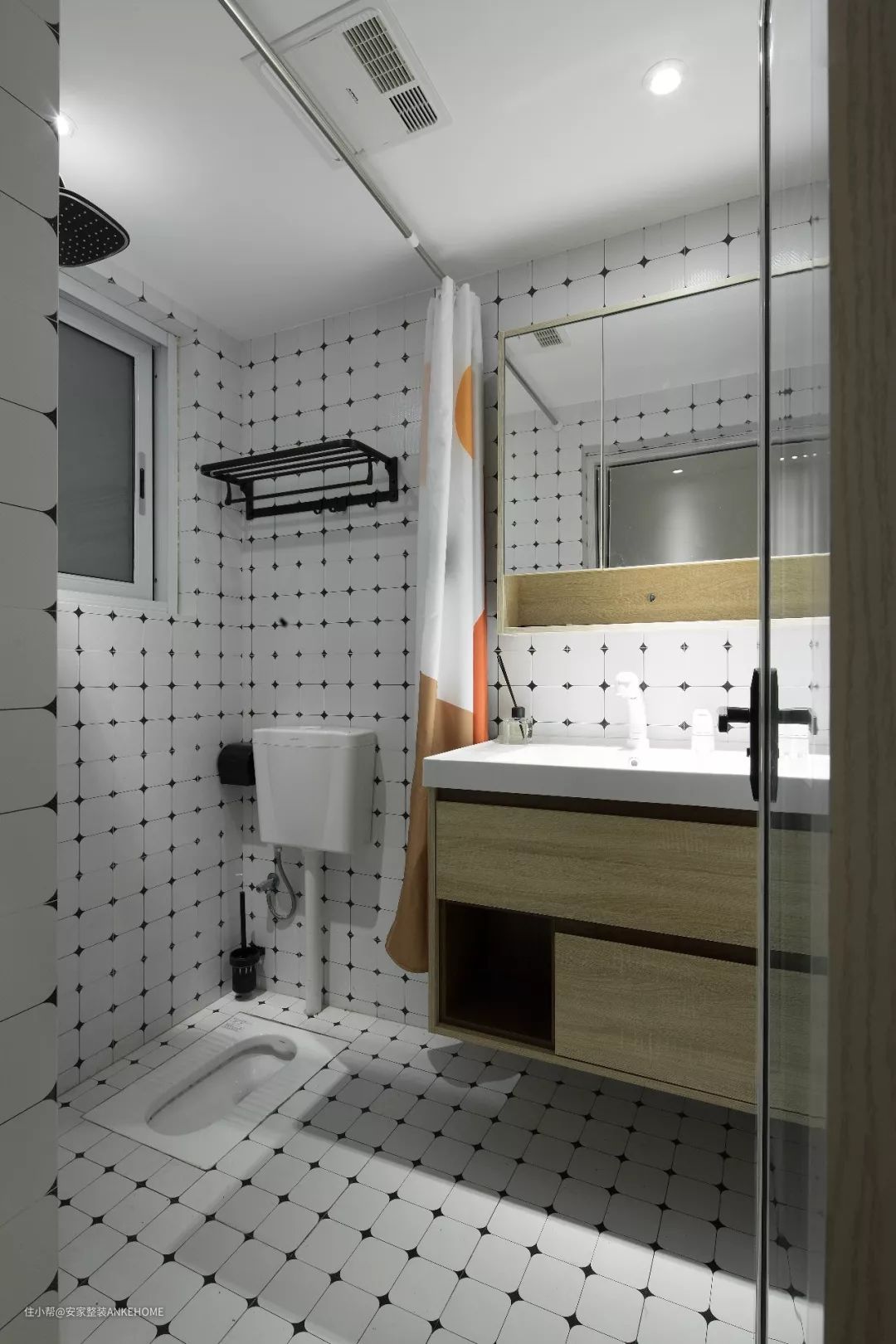 卫生间位于厨房的侧方,所以墙地砖也延续了厨房的设计方案。设计师用蹲厕来代替马桶,浴帘代替淋浴隔断,让卫生间不会显得太过拥挤。