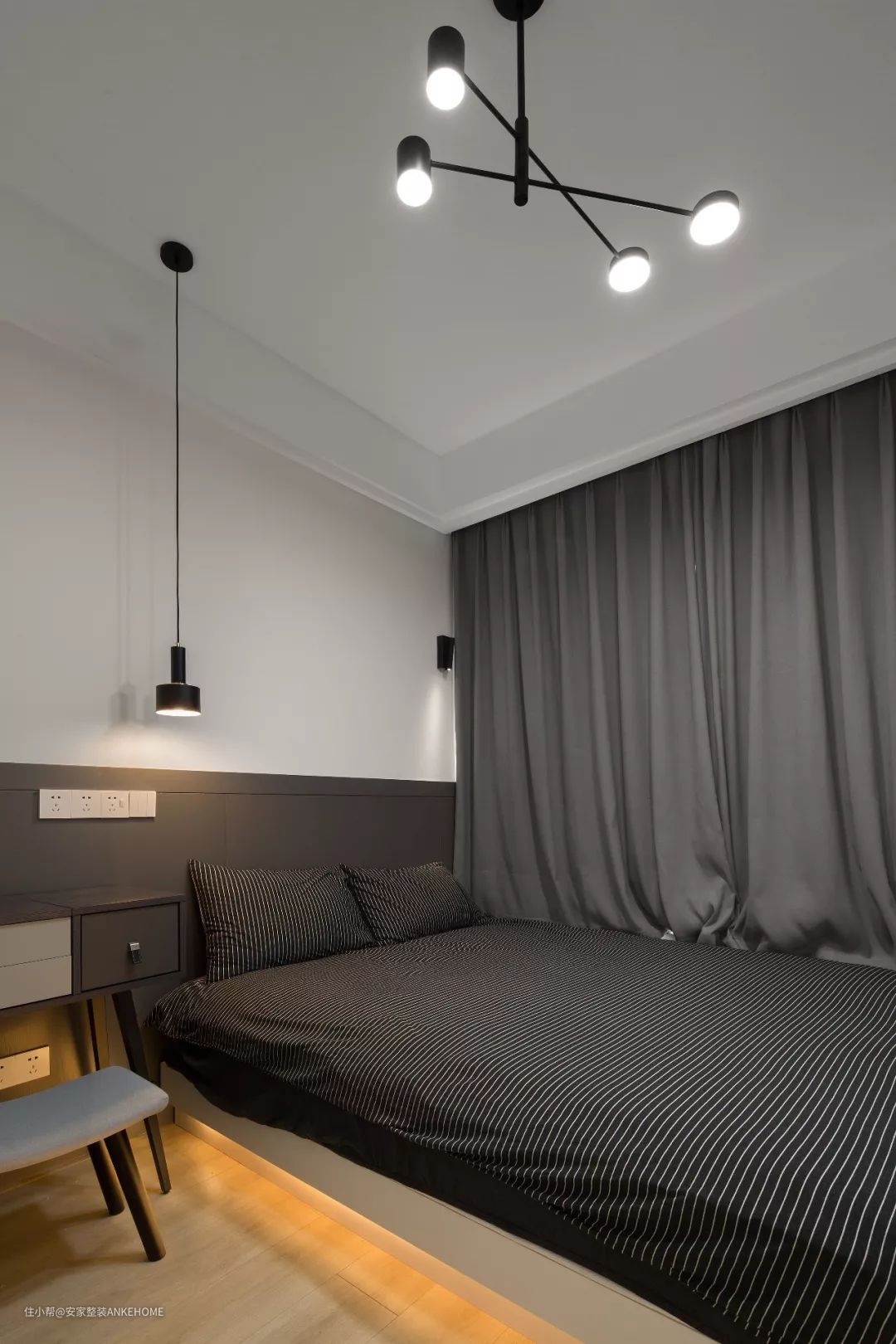 主卧室的配色是以白色、灰色和黑色为主,点缀木地板看起来更加温馨。床的底部加上藏光,舒适的床头靠背也是很好的装饰品。