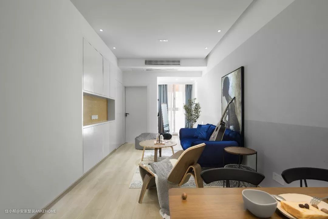 客厅和餐厅之间没有做隔断,顶部的天花板、底下的地面和中间的墙面都做了相同的设计,这样整体如一的空间,很适合小户型。