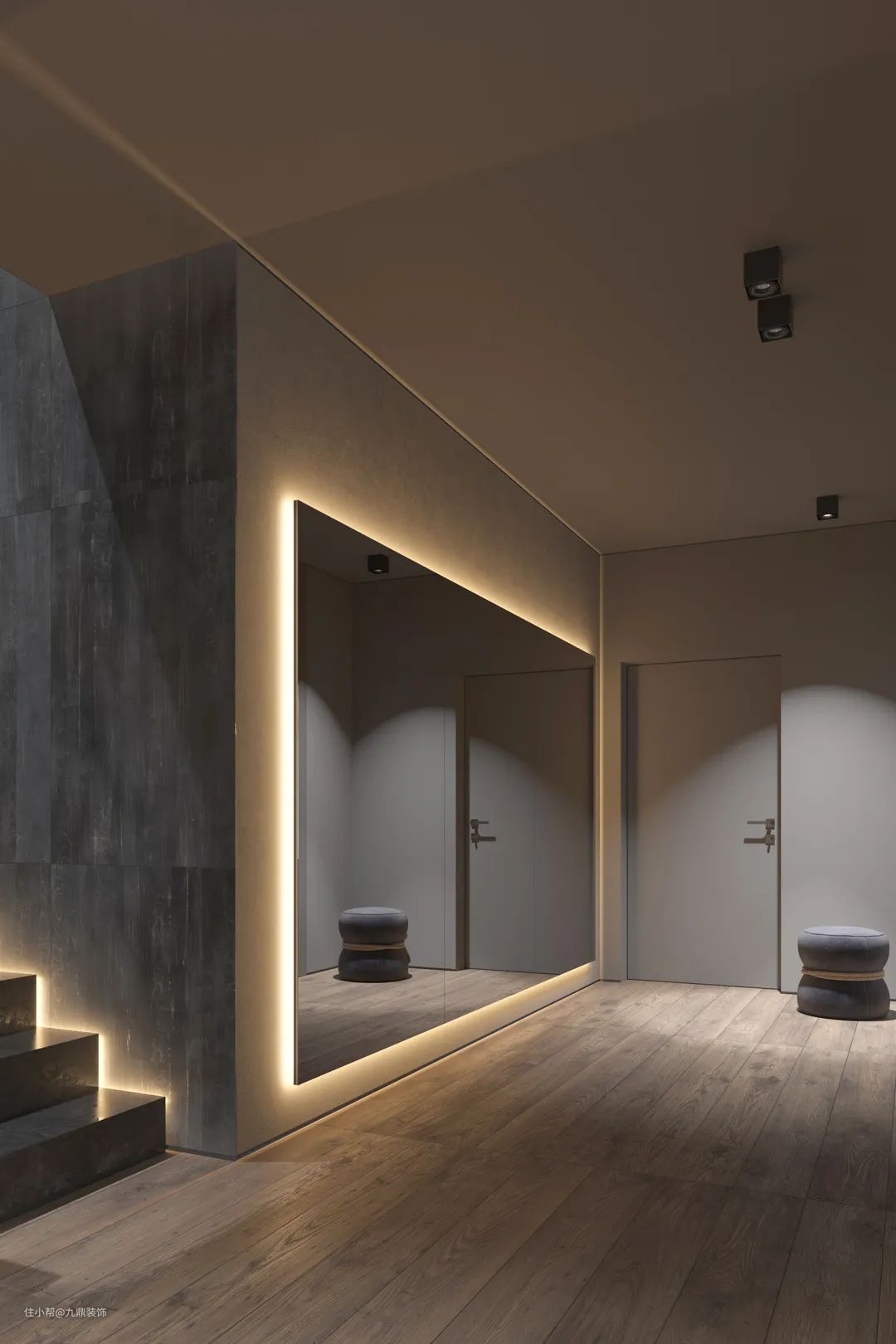 ▲镜子与灯光搭配出的氛围感是两者单独表现不了的,现代风的轻奢家用简约的玄关镜与灯光最能适配。