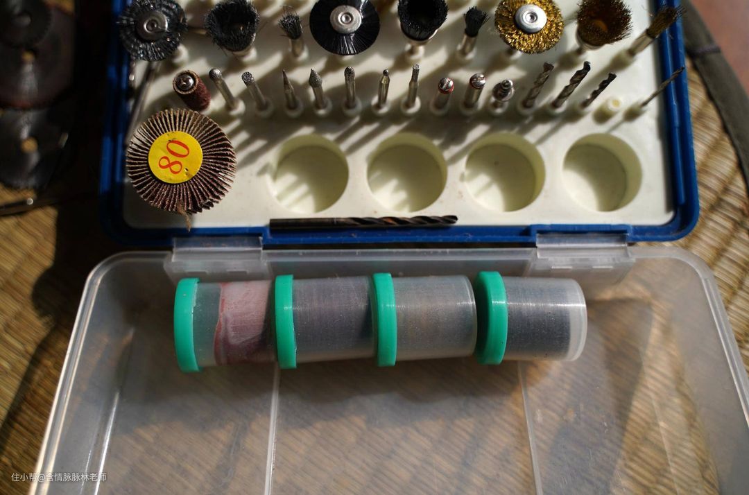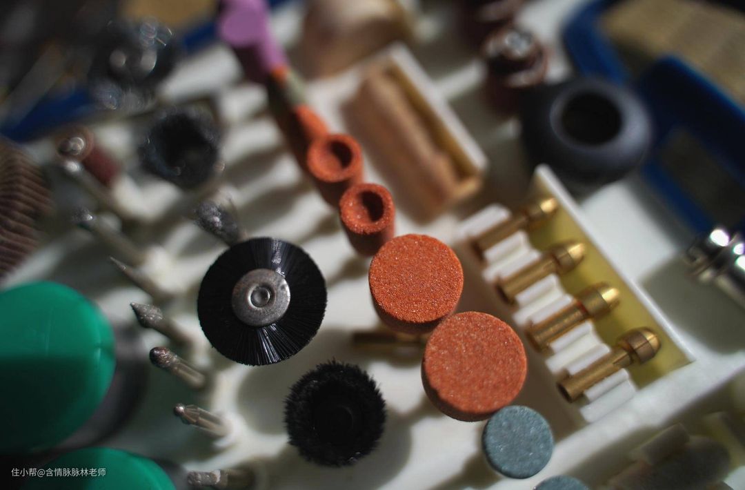▲手头的打磨工具不少,牌子忘记了,反正挺好用的,带有不同的雕刻磨头,打孔工具,羊毛抛光工具等等,到现在我也一直留着。