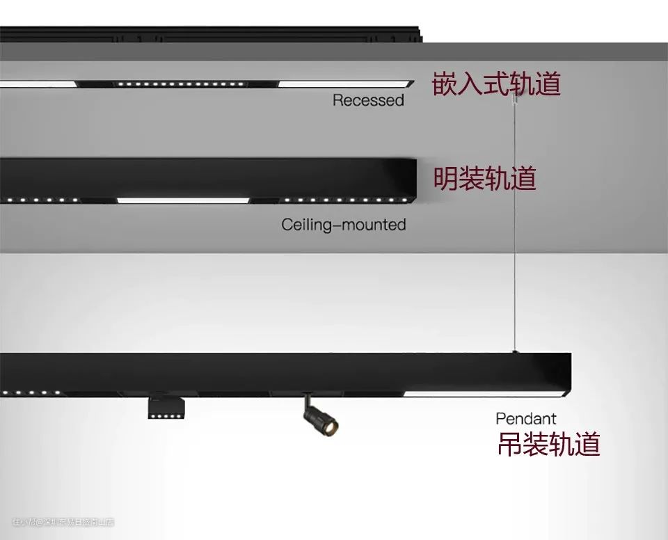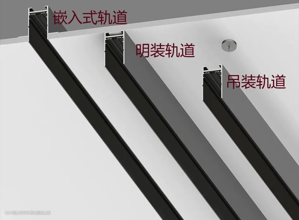 嵌入式轨道 嵌入式轨道是暗装在吊顶内的轨道,这样的轨道安装必须要有吊顶的配合,这里需要注意一下轨道的宽度,一般有40MM和25MM两个尺寸,40MM多用于公装设计,家用建议选择25MM。