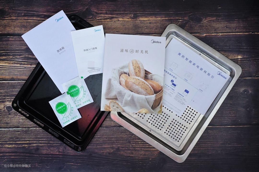 机器挺重,包装严实。配件有蒸烤盘、烤盘、除垢剂、快速使用指南、说明书、两个跟联网相关的指南,还有一本定制食谱,对应机器自带的30道菜谱。