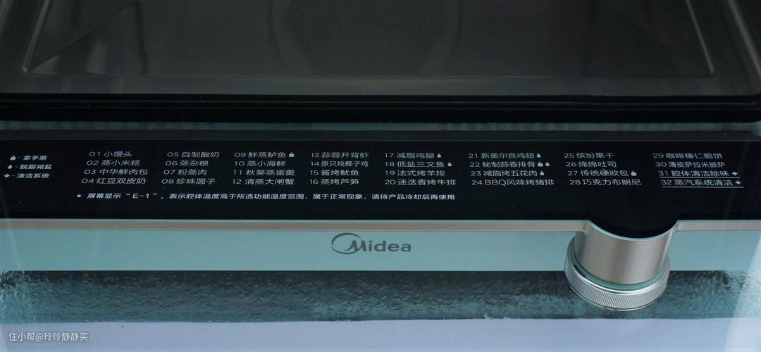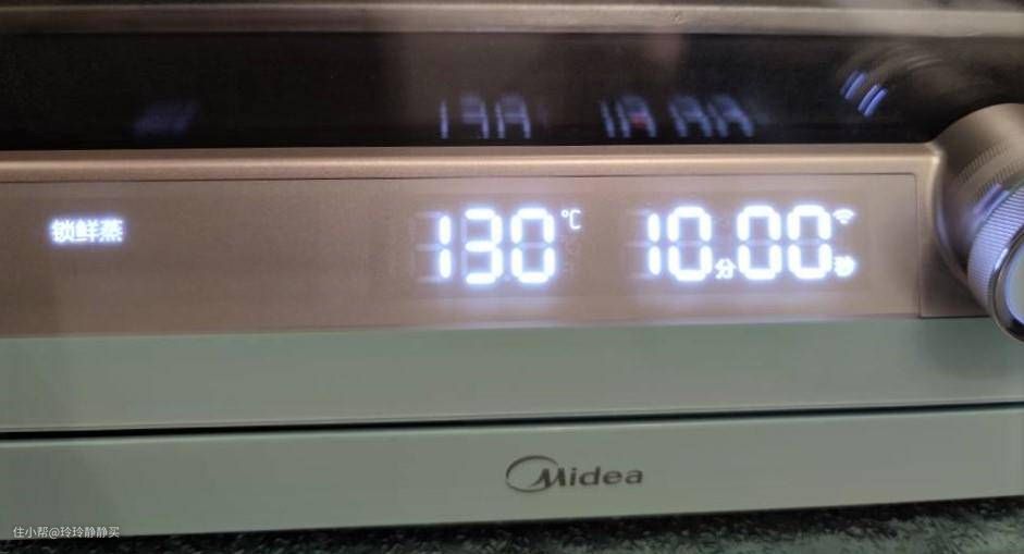 超大透明视框,很敞亮。视窗右下角有一个旋钮,整机结构简洁明快。通电后,在旋钮上和视框底部有液晶显示,挺大气的。有纯蒸、锁鲜蒸、热风烤、脱脂烤、发酵、杀菌、菜单等程序。