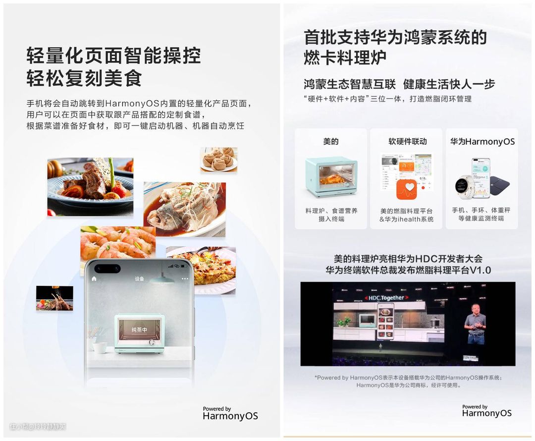如果是带NFC的华为鸿蒙系统手机,连下载APP的环节都省了,直接跳转手机控制页面。即所谓的轻量化页面操控。而后续健康有关的鸿蒙系统手环、体重秤等也能跟蒸烤箱互动上。