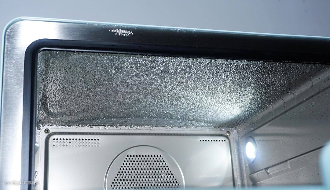 用到后面才发现腔体顶部还有科技,并不是平的,是向上凹进去的,官方叫4°微弧穹顶,能起到防滴水的作用。通过图中可以看出,冷凝水滴确实不掉下来。用过蒸箱的能了解,防冷凝水滴落有三个好处,一是不会出现冷凝水掉下来二次蒸发的情况,更干净;二是蒸的东西没有蜂窝孔;三是蒸的东西不会被冷凝水弄湿影响口感。