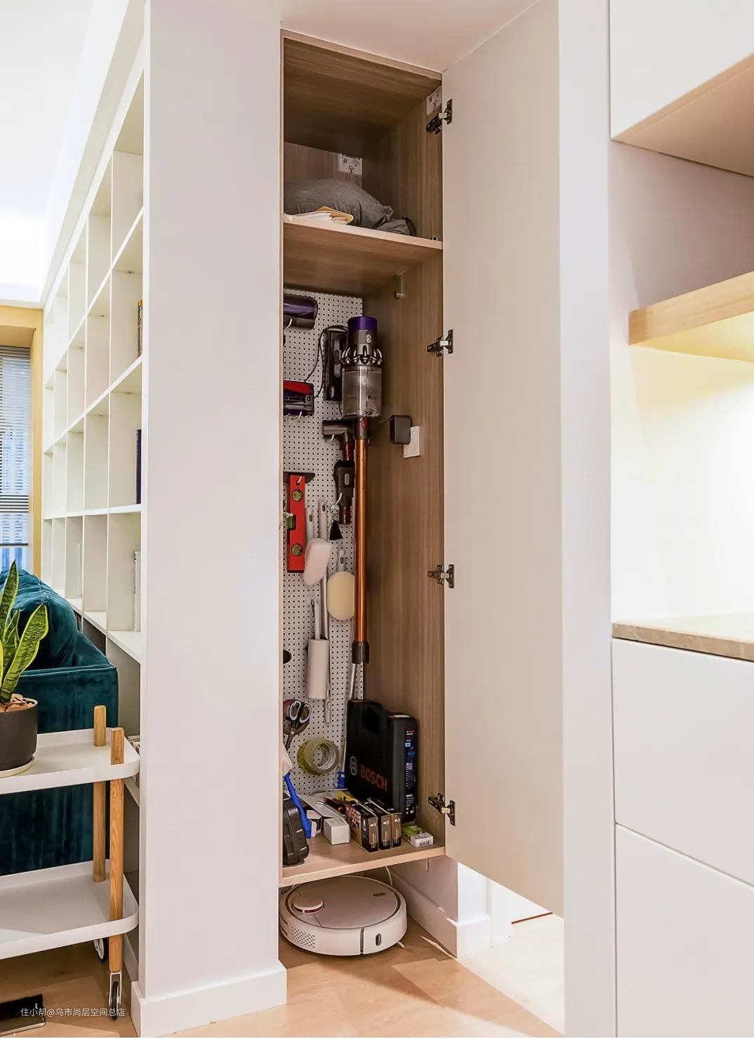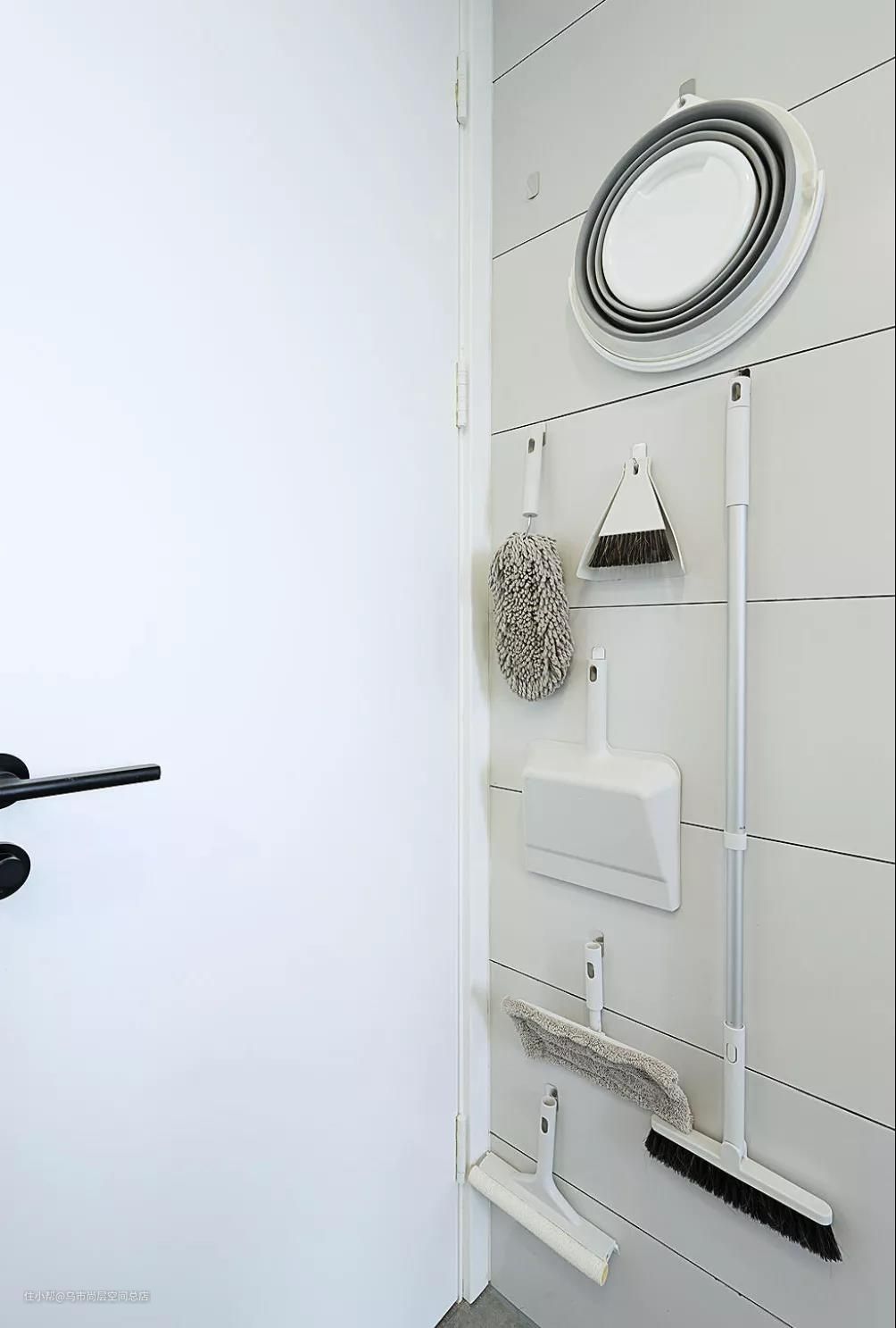 我个人觉得,至少有个1平米左右的位置做个柜子来专门存放打扫卫生的这些用具,可以用一块洞洞板把这些都挂起来。