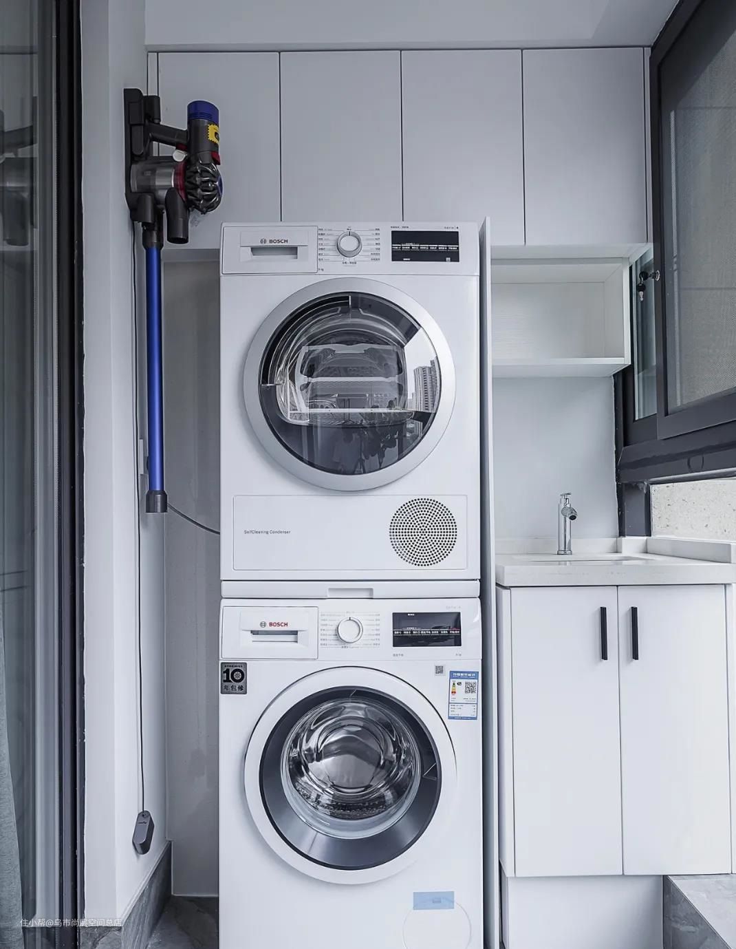 阳台放洗衣机的位置,如果边上还有位置的话,可以留一部分给这些打扫工具。