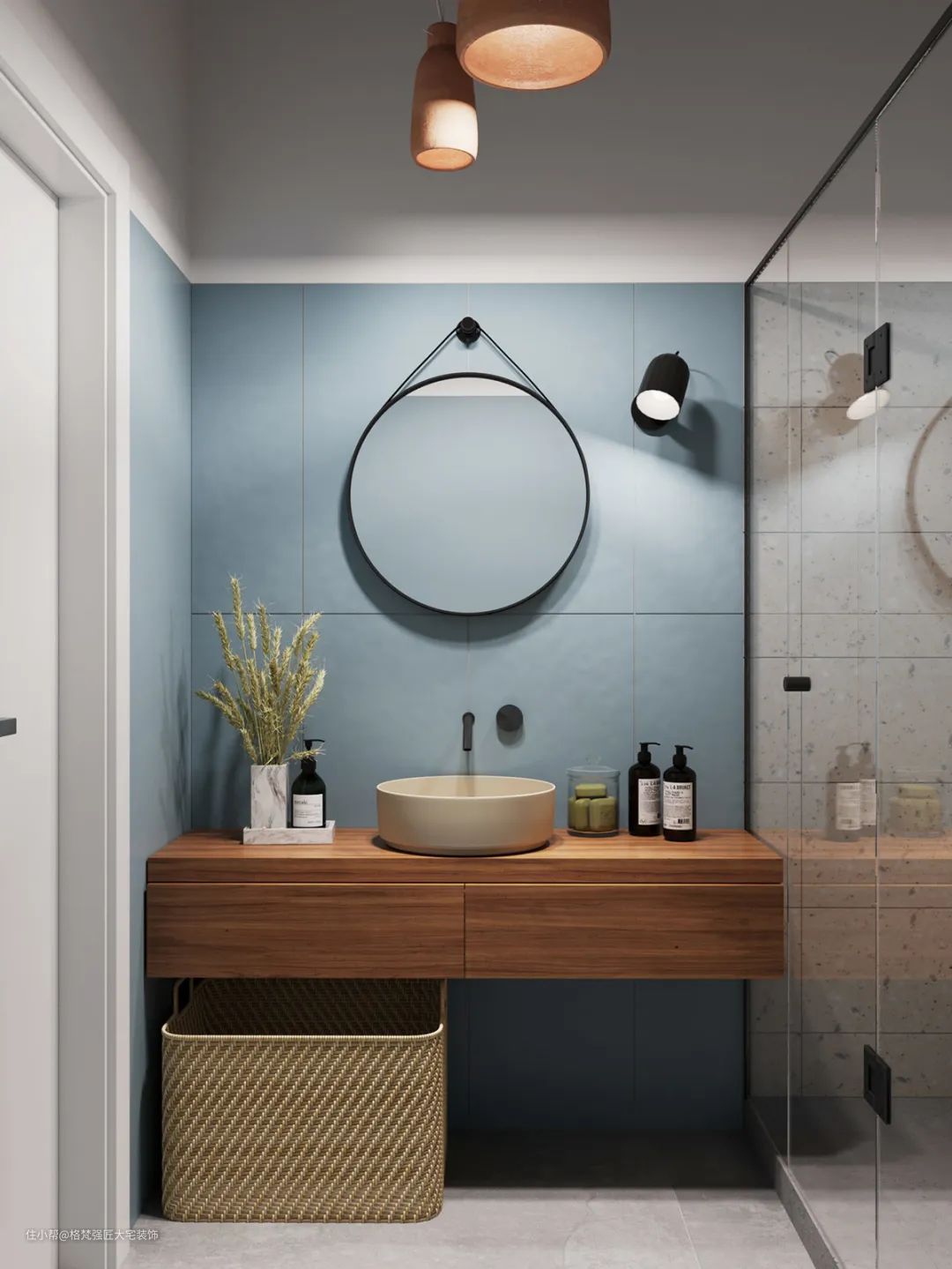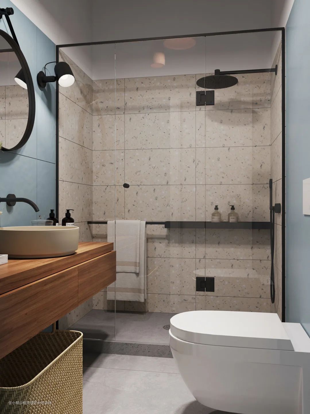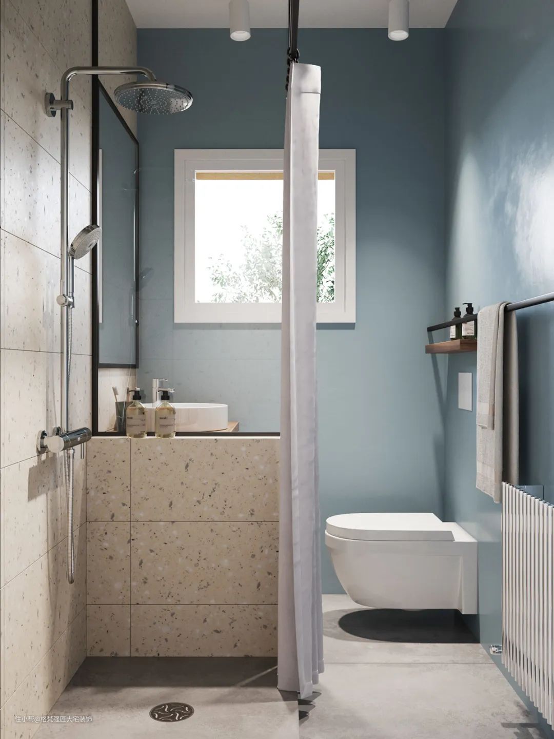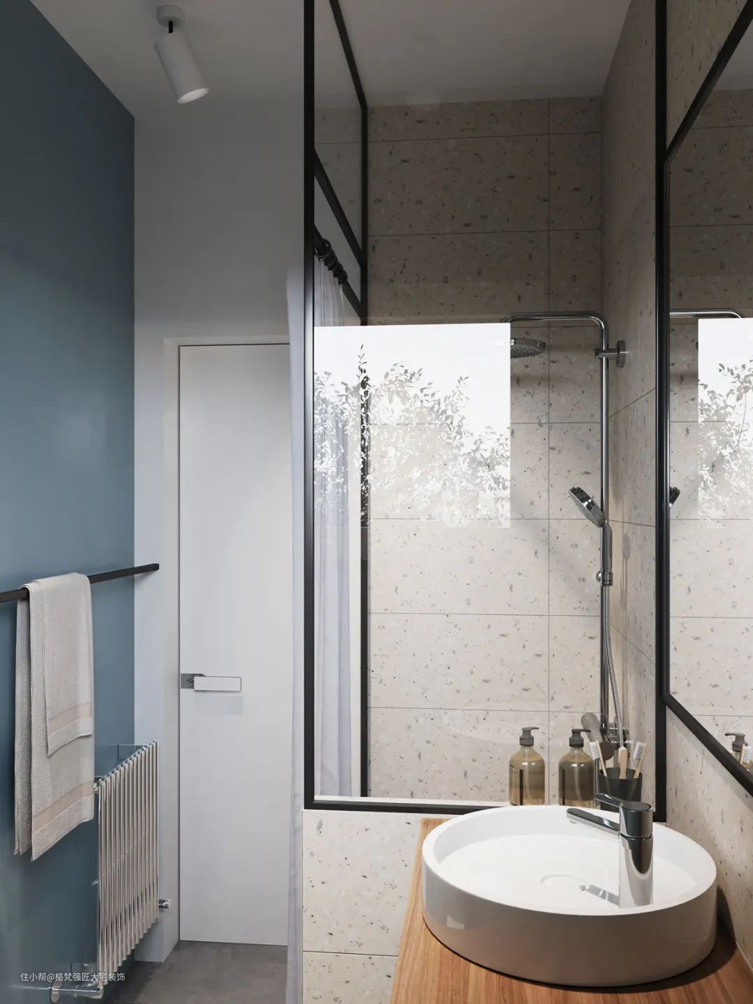 ▲卫生间①装了一个木色的洗手盆柜,结合蓝色的卫浴空间,还有水磨石的淋浴区设计,整体空间简单而又优雅舒适。