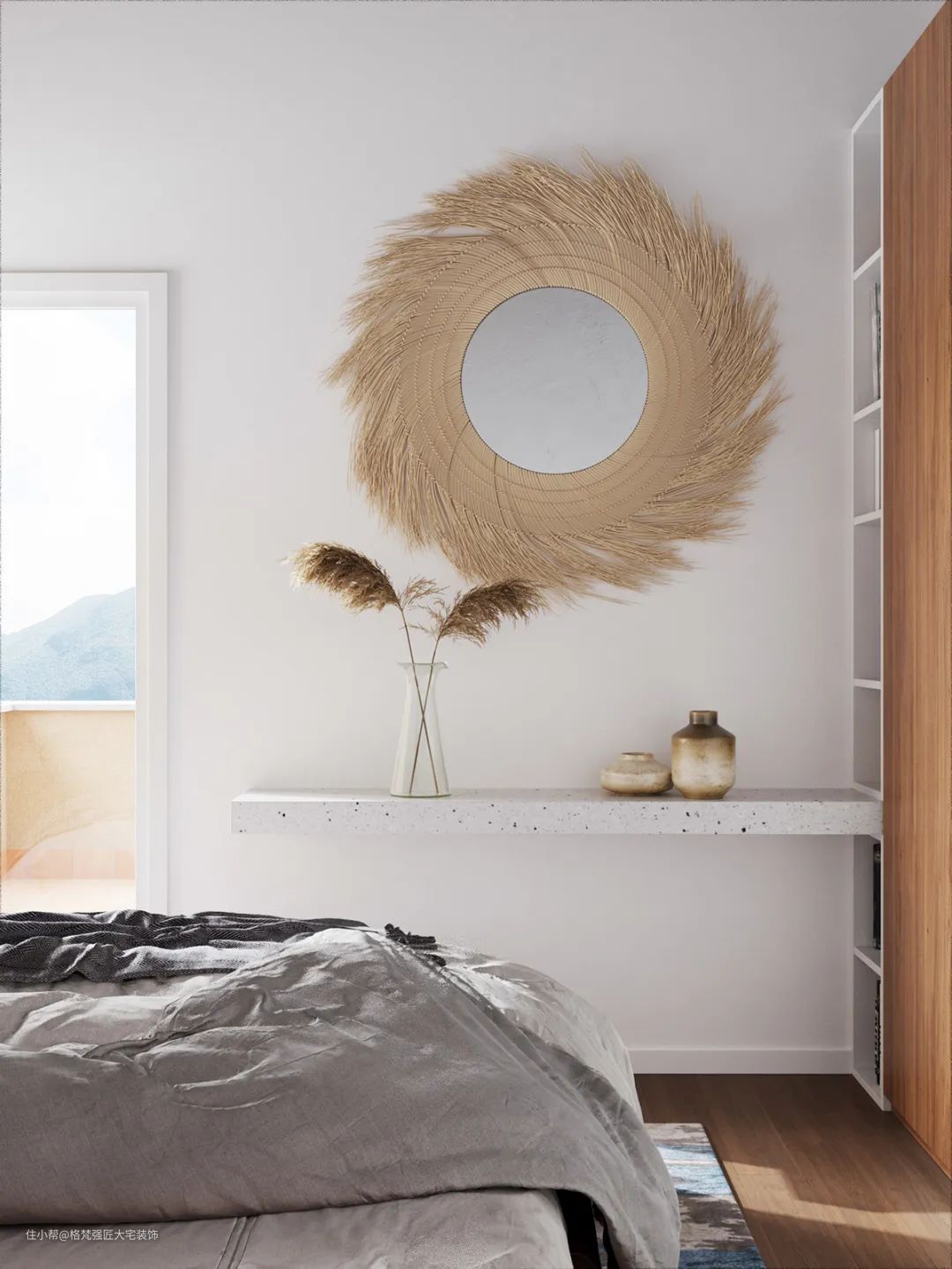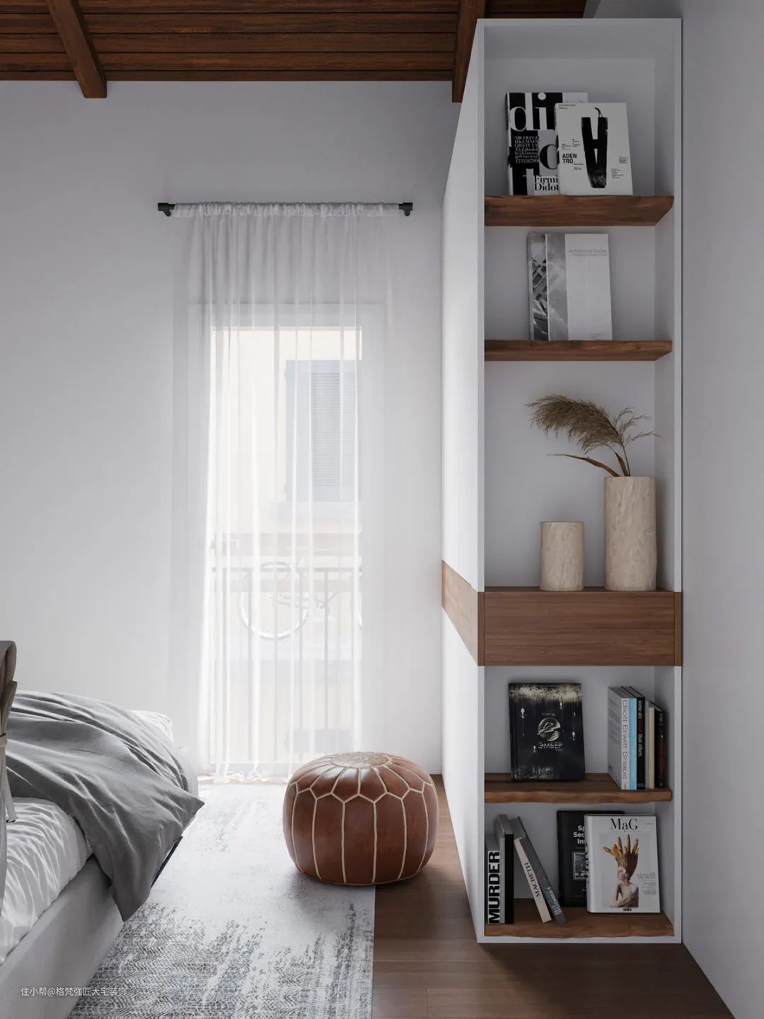 ▲衣柜的侧边还是别有洞天,设计上一个多层木质展示架,摆上书籍与花瓶,也让空间显得更加现代优雅。