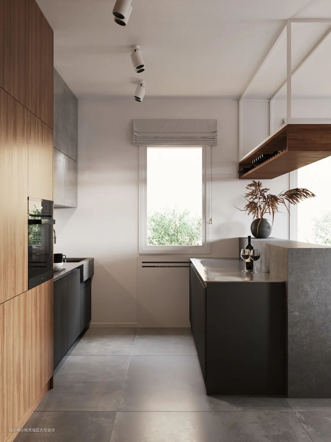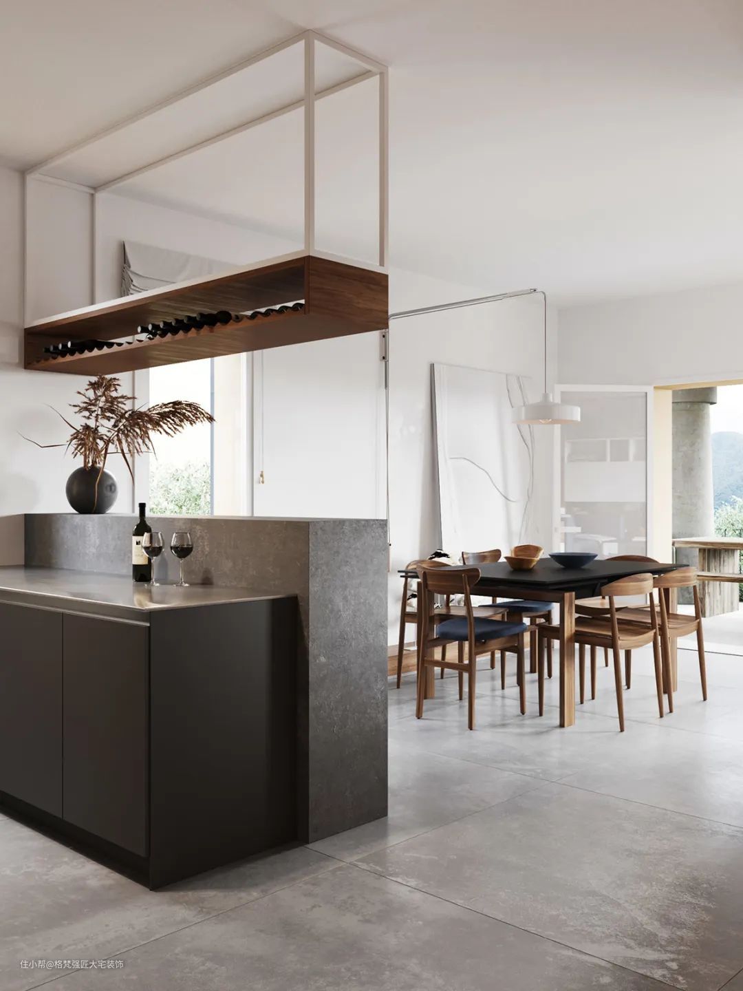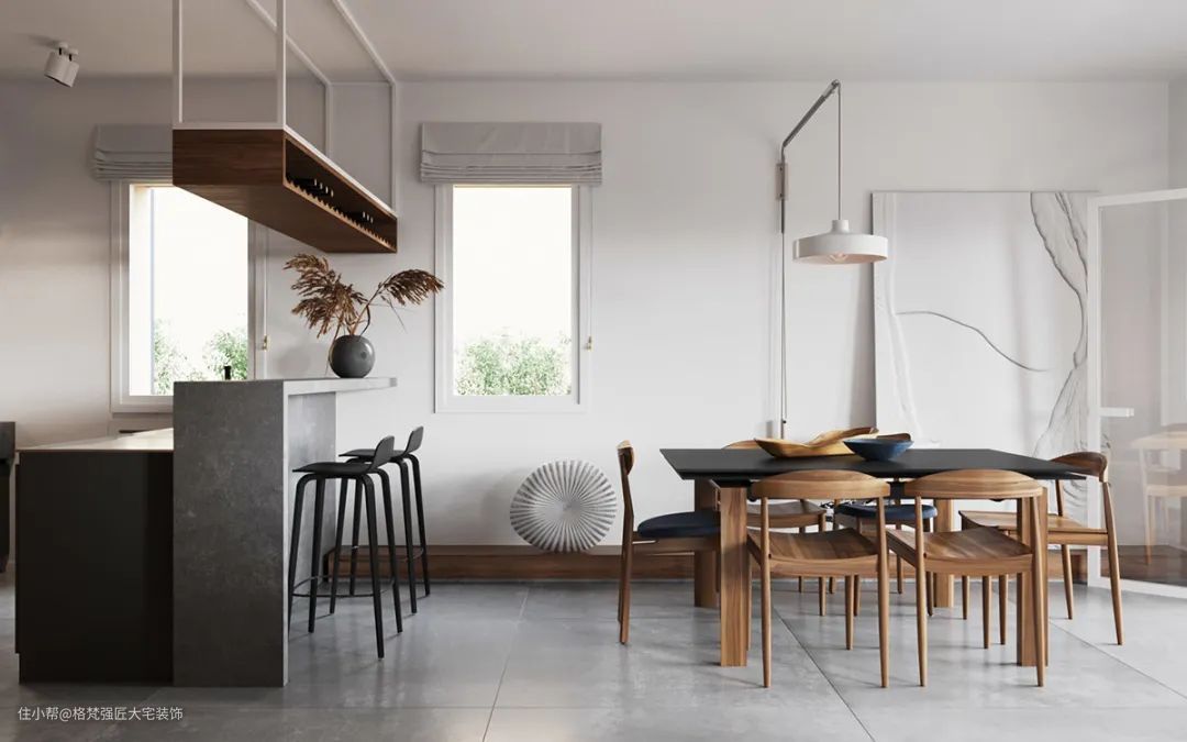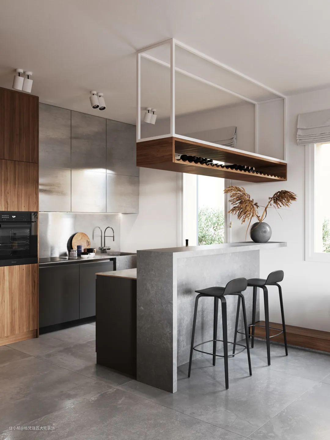 ▲以灰色亚光砖地面基础,金属吊架酒架,还有高脚吧椅布置,让餐厨空间显得惬意优雅而舒适。