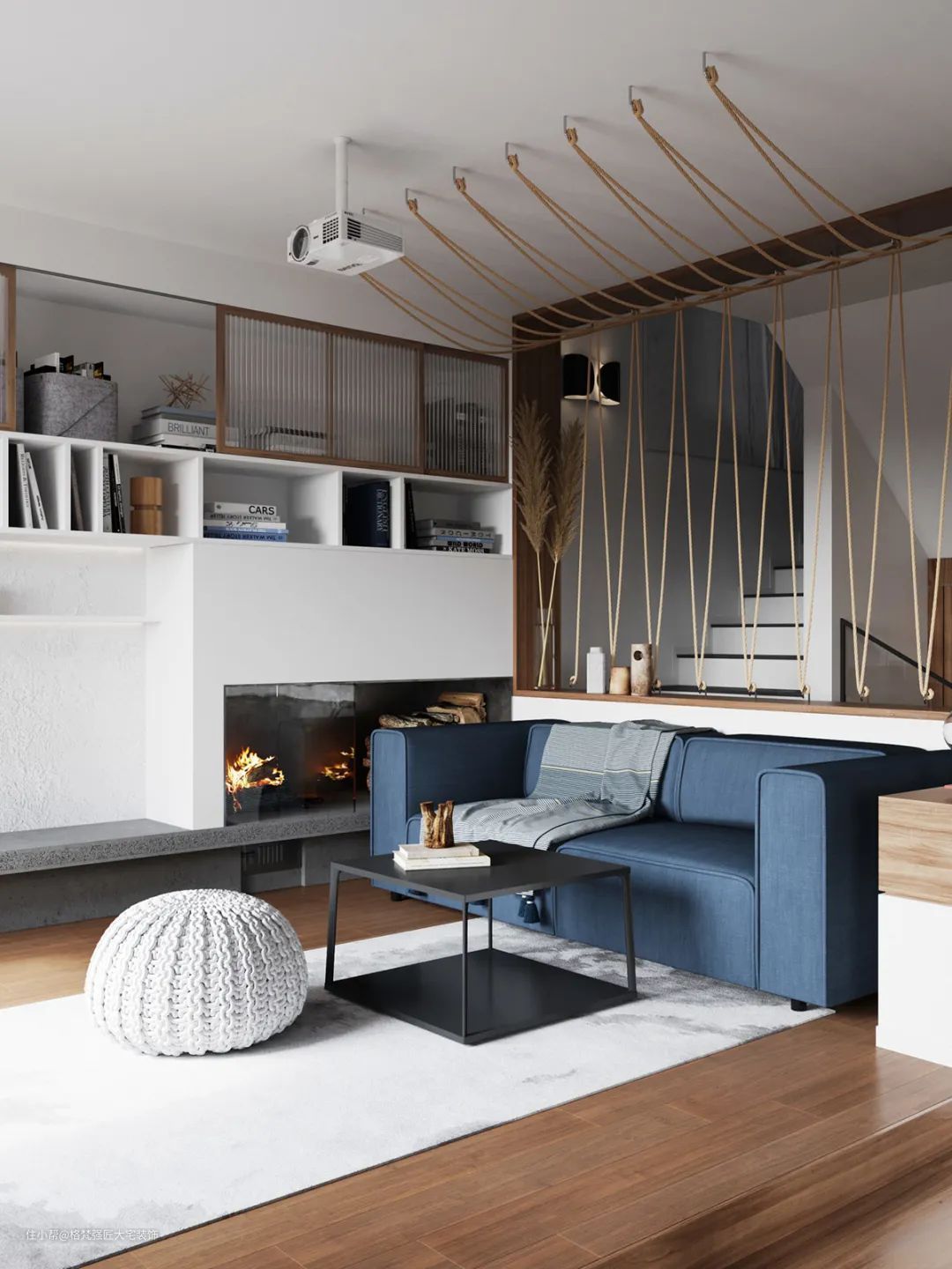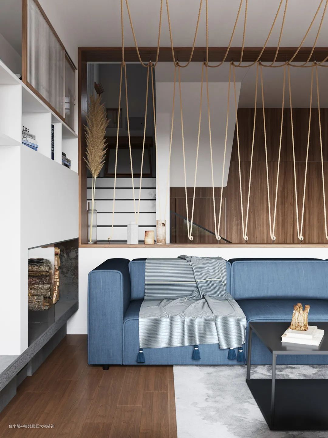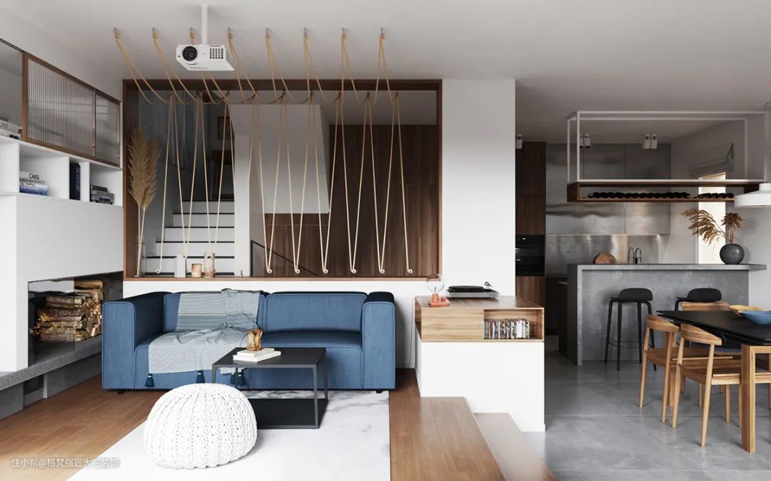 ▲客厅整体空间设计比较随性,沙发墙是一个室内窗造型,以绳子作为装饰,让空间呈现出一种优雅舒适的民宿风情。