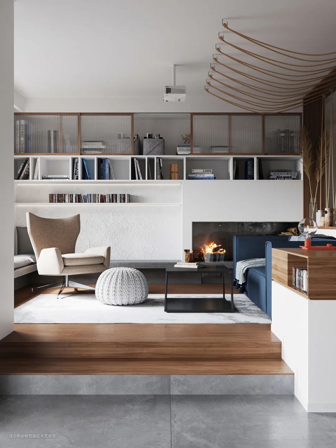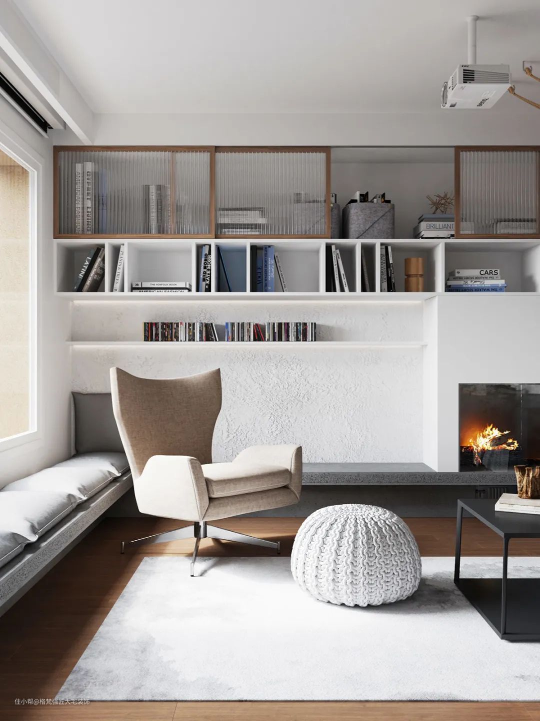 ▲客厅旁边的壁炉、书架与顶部长虹玻璃柜门,整体空间的元素丰富,质感舒适而安静惬意。