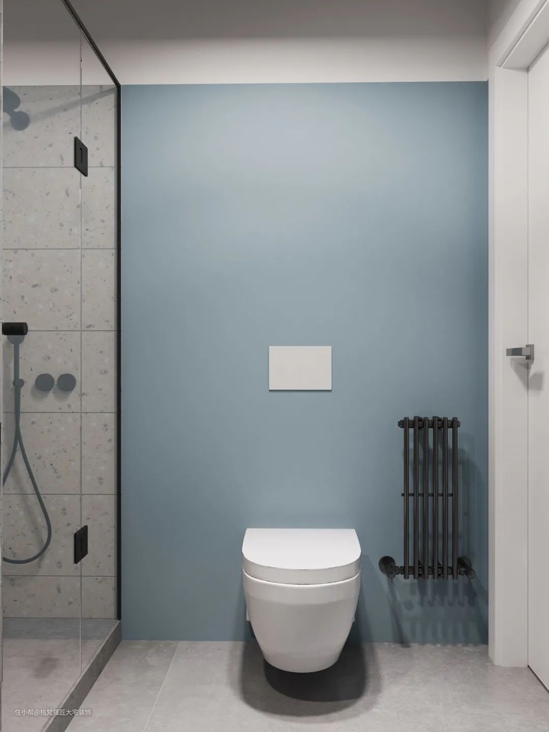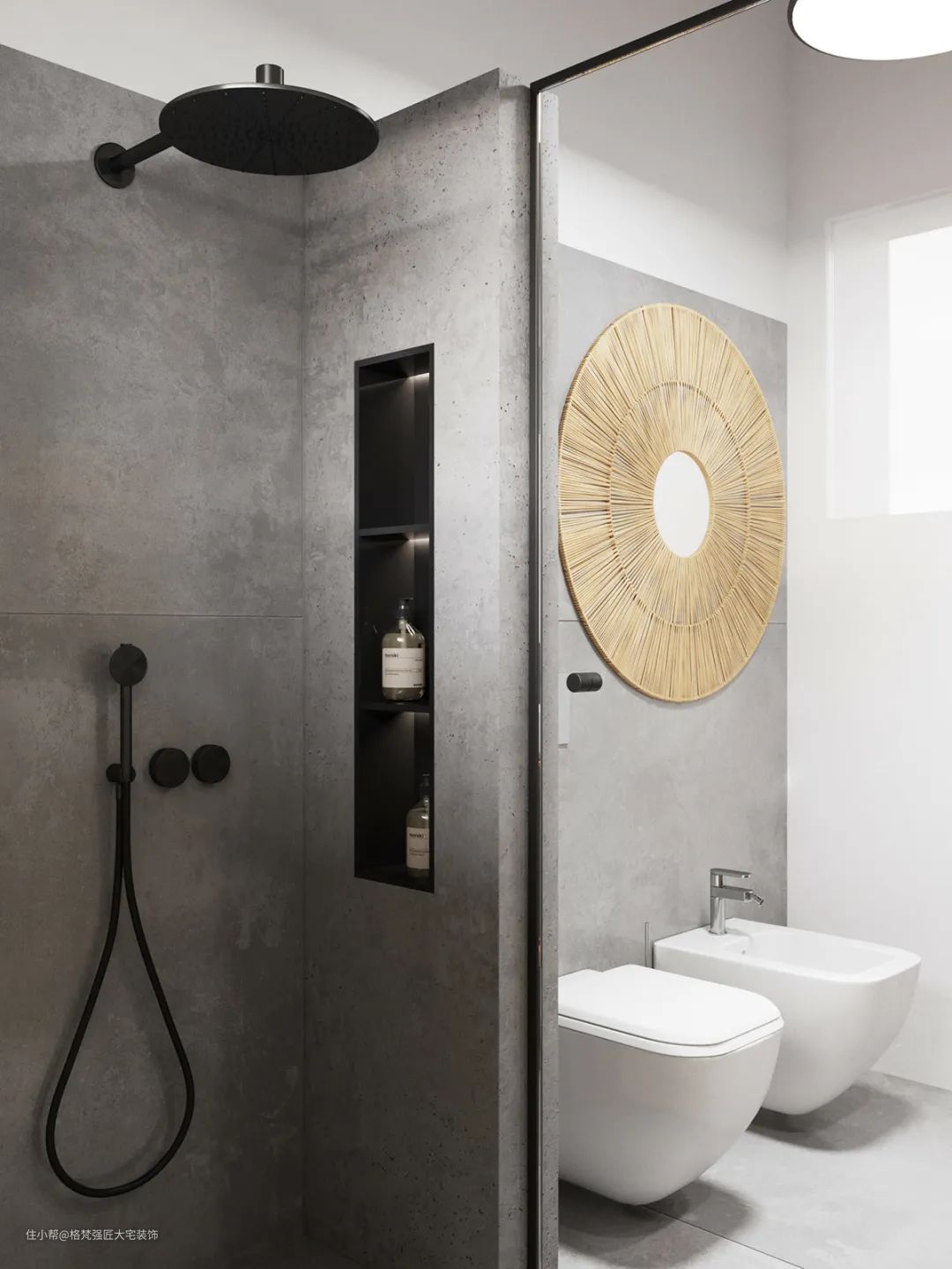 ▲浴室整体以水泥灰色的空间,结合黑色的花洒,侧边还有一个壁龛,带来的是一种极简而又实用的卫浴空间。