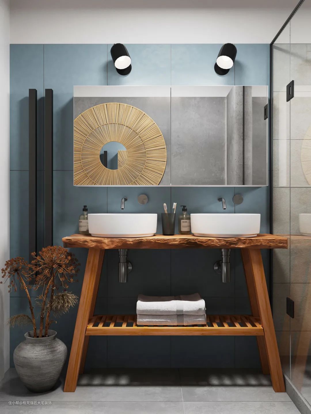 ▲双人洗手盆,木质架子+台上盆设计,让卫浴空间显得更加艺术雅致。