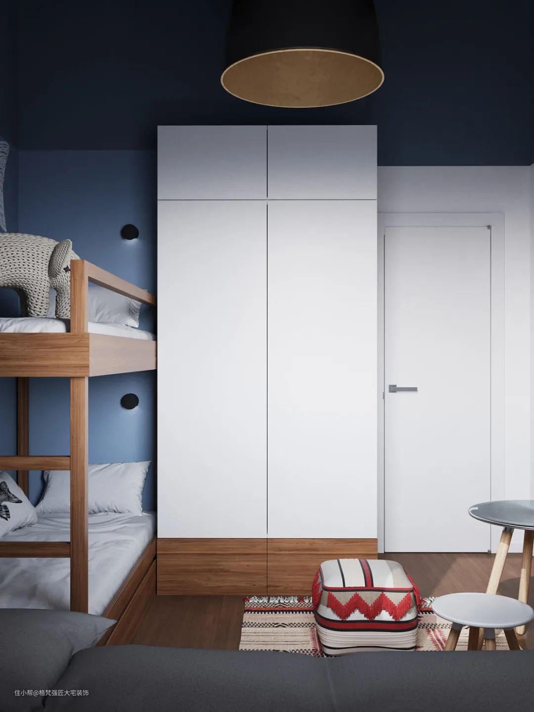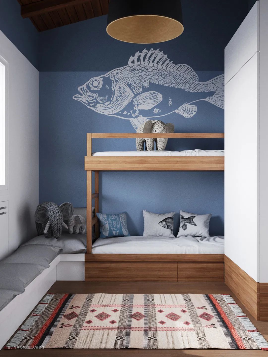 ▲儿童房靠墙四周做了卡座设计,搭配定制的上下床,蓝色墙面上做了一条大鱼墙绘,让儿童房空间显得安静舒适而又童趣。