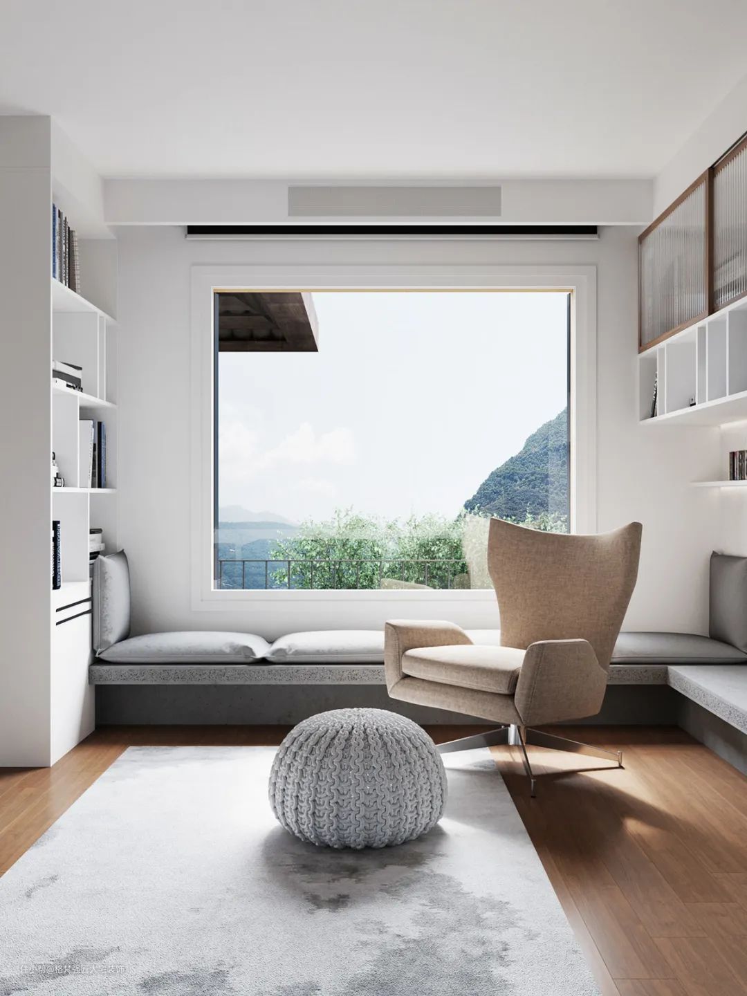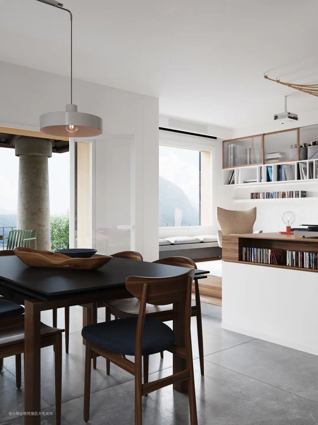 ▲窗边做了一排的飘窗座位,让客厅可以容纳更多座位。而且窗户上方也做了投影幕布,降下幕布可以让客厅变身为影院空间