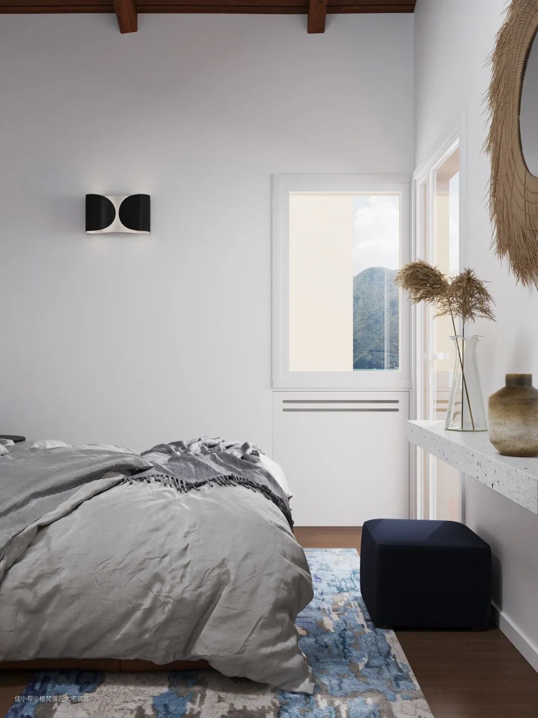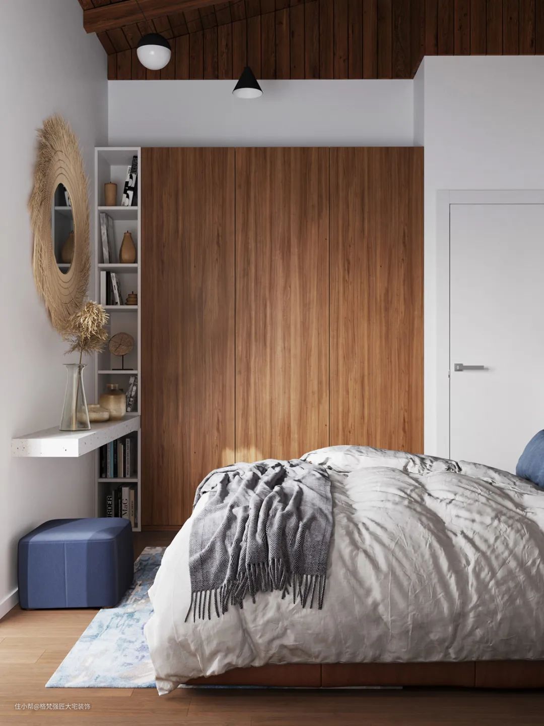 ▲在预留的凹位装上木色的衣柜,还有一个极简的悬空梳妆台,衣柜里侧作为梳妆用品的摆放位置,搭配一个蓝色布艺小凳,也让空间显得更加简约自然。