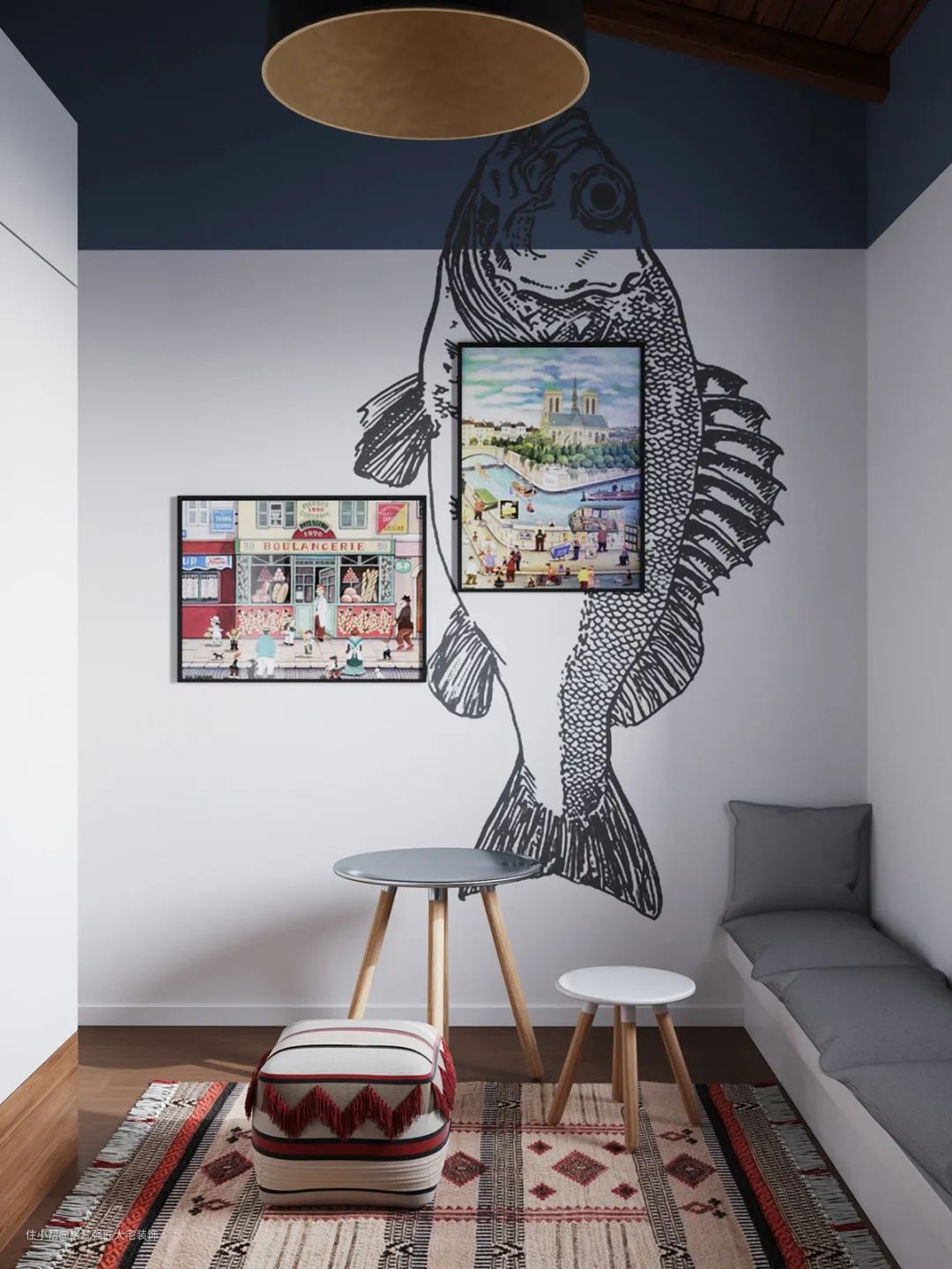 ▲另一侧的墙面也是做了一个鱼形的墙绘,挂上几幅漫画装饰画,使得空间活泼也有生动舒适。