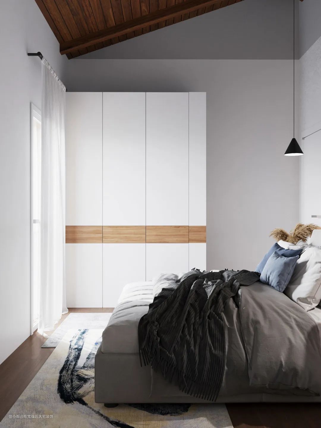 ▲极简的衣柜以白色柜门主体,中间加入木色的装饰,也让卧室显得更加现代舒适。