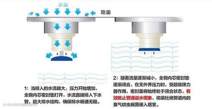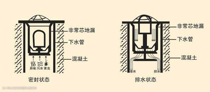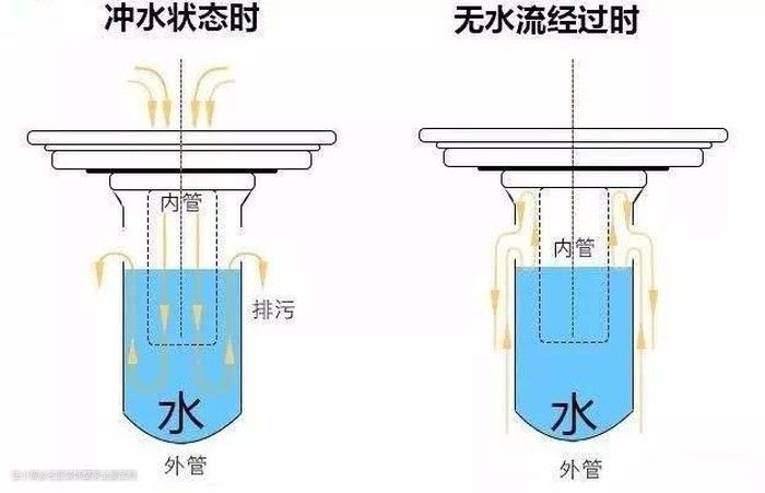 原理:深水封地漏的原理其实就是我们在厕所的下水管能够常常见到的存水弯的缩小版。使用完一部分的水留存在地漏里面,防止下水道的气味反串以及蚊虫的进入。