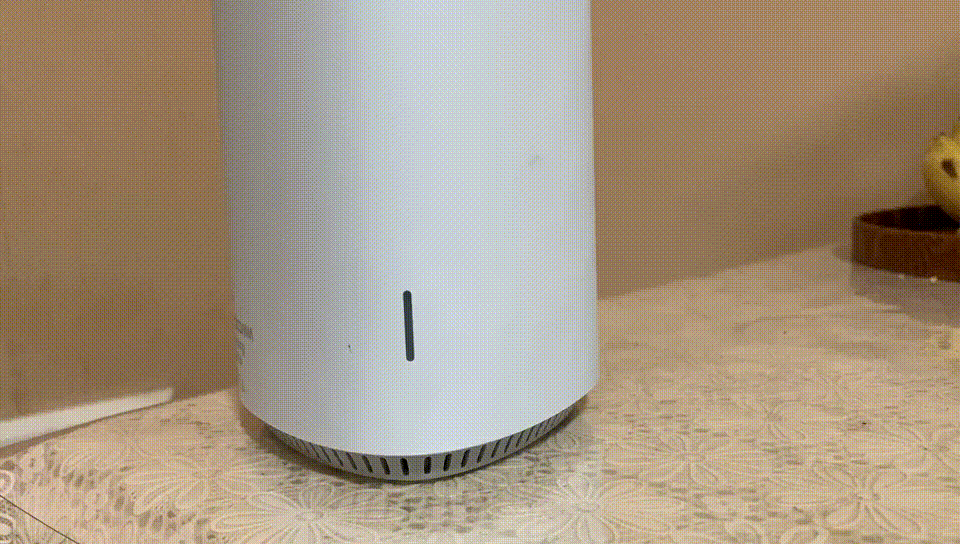 在外观设计上,这款路由器非常简约,整体是一个柱状外形,从顶部看是一个等边三角形,只不过边角很圆润,与传统路由器外置天线不同,它的天线都是内置设计。