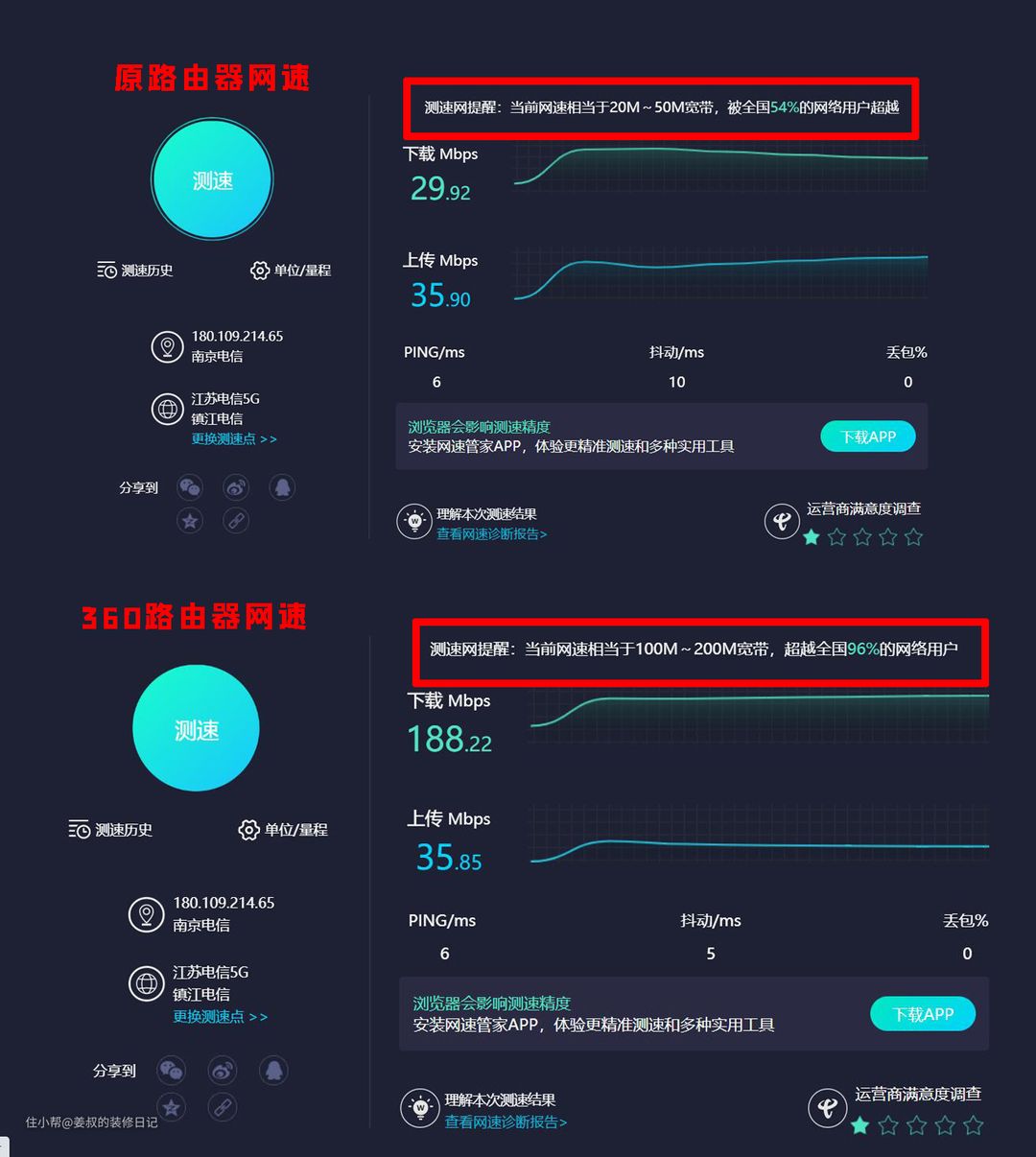 下面直接跑下网速,看看更换路由器对网速提升效果如何,测试位置都为卧室。网速下载29.92Mbps,上传35.90Mbps,相当于20-50M宽带;而在更换360WiFi6全屋路由后,下载188.22Mbps,上传35.85Mbps,也符合200M宽带的标准,对网速的提升还是非常明显的。