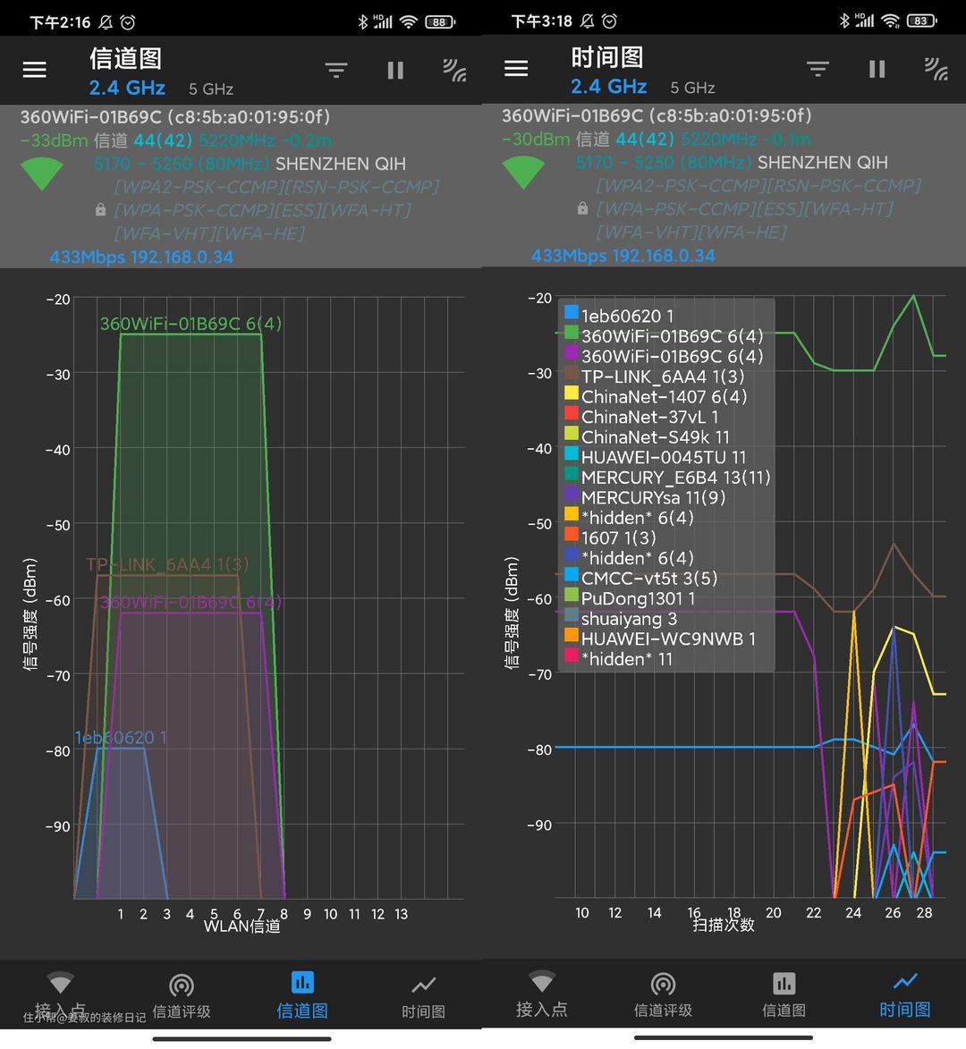 在使用方面,360WiFi6全屋路由总得来说还是很好上手的,即便是网络小白也能轻松完成,当然路由器最核心的就是网络体验,比如网速提升效果、稳定性、信号强弱,我家使用的宽带是江苏电信200M宽带,按说这个速度家用也够了。但是好网配了一个差路由,运营商自带的路由器信号太差,特别是我在卧室办公时,笔记本经常掉线,一开始我以为是笔记本无线网卡有问题,在更换新网卡后,还是会经常出现掉线的情况,直到换了路由器才发现,原来我家网络差的「病因」在这里。下图是更换路由器前后的信号强度对比,更换前卧室信号通常只有一格信号,好点的时候会有两格,更换后一直处于满格状态,而且从来没有出现过突然掉线的情况。