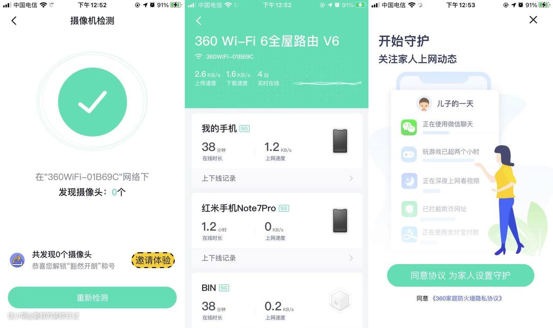 好的硬件离不开好的软件设计,360家庭防火墙在使用方面也非常人性化,它可以检测当前网络下的联网设备,并可以对每个设备进行网速限制,还有可以查看网络下有没有摄像头,还有一个我觉得很实用的功能就是防沉迷设置,可以将某个设备添加进去,这样可以查看上网时间,用时较长时会有提醒,适合家里有孩子的情况。