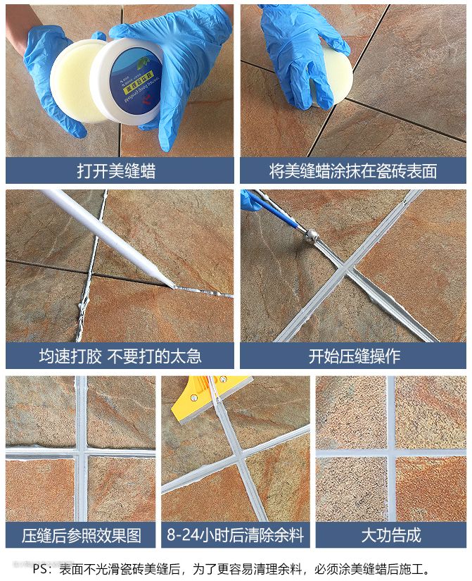 ①首先选择适合自己家方式:美纹纸或美缝蜡。美纹纸适合规格较大表面平滑的砖,施工会相对麻烦一点;美缝蜡适合仿古砖一类表面不是很光滑的,大面积使用更加轻松。
