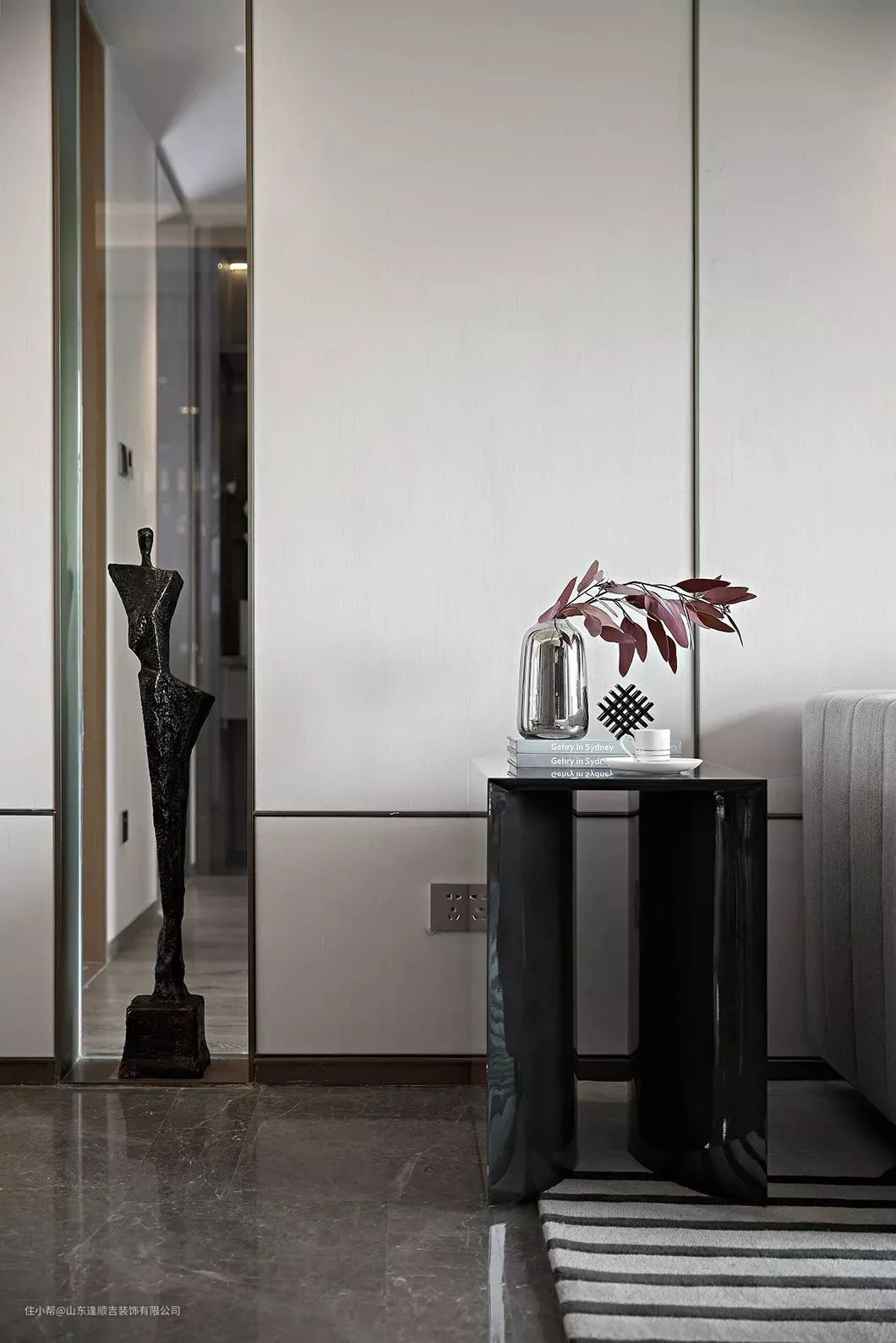 ▲黑色亮面台面的茶几,布置上雅韵端庄的装饰品,也让客厅氛围显得更加现代时尚而高级。