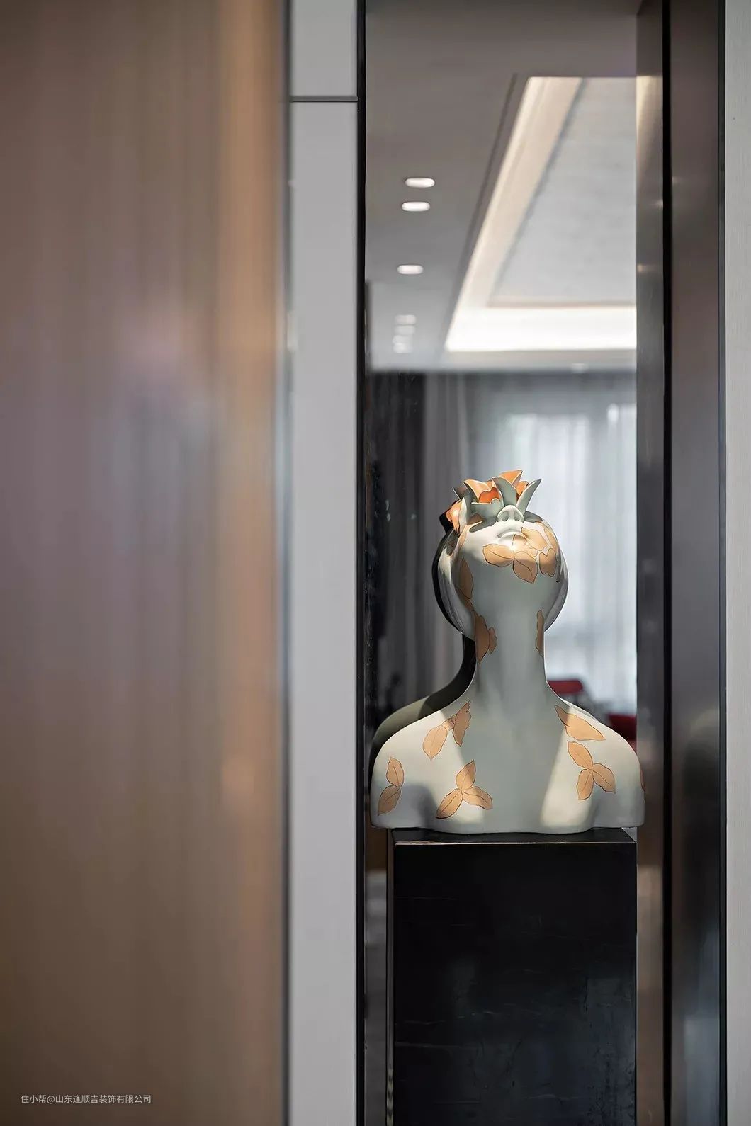 ▲电视墙以木饰面与镜面元素的设计,在镜面元素前摆上端景台,摆上一个少女雕塑,也让空间显得更加优雅别致。