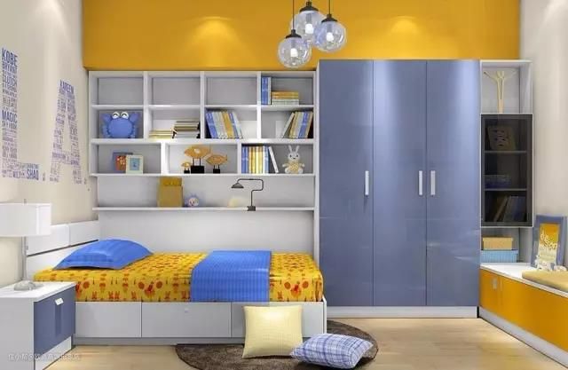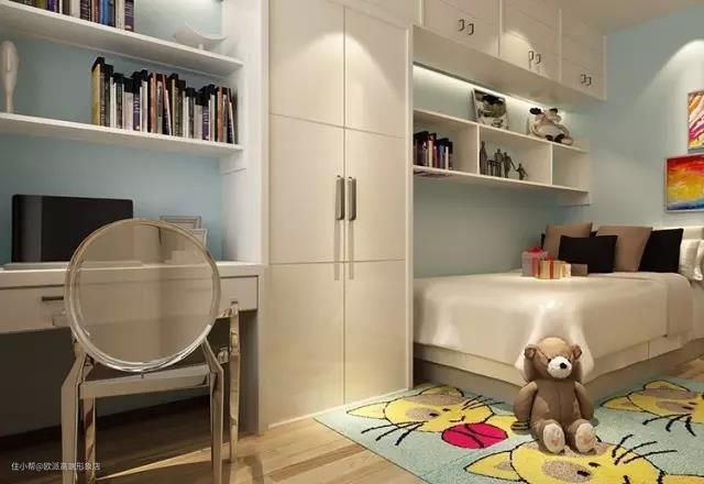 最好能在衣柜设计时就考虑一个大的通体柜,只有上层的挂件,下层空置,可方便儿童随时打开柜门取放和收藏玩具,满足儿童好玩的心态。