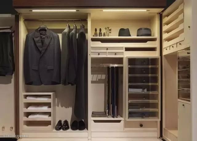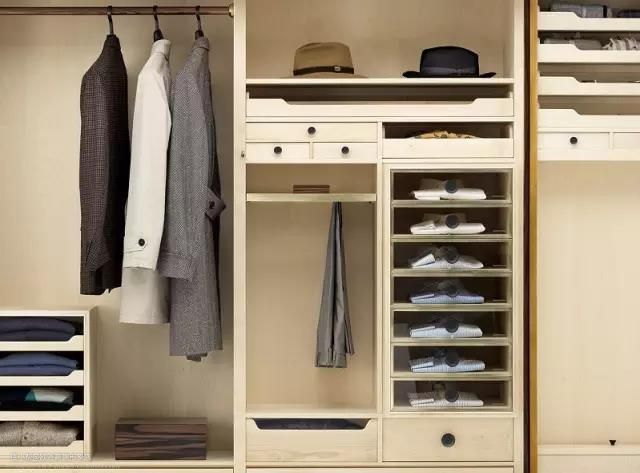 内衣、领带和袜子可用专用的小格子,既有利于衣物保养,取物也更直观方便;毛衣可放在较深的抽屉里;裤子则用专用的挂架存放。